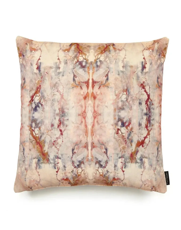 A portrayal of bohemian exotica, the Blotto Collection is a collaboration between British artists, Paris, and Nosca Inc. Introducing a sensual marbled design with subtle complementary tones and veins of hand-painted texture, this collection is based on a misty, delicately blotted watercolor composition by Paris, which is digitally infused with Nosca Inc’s hypnotic pattern repeats. 17 patterns invites you to immerse in the comforting warmth of this blissful, cotton velvet lumbar cushion.