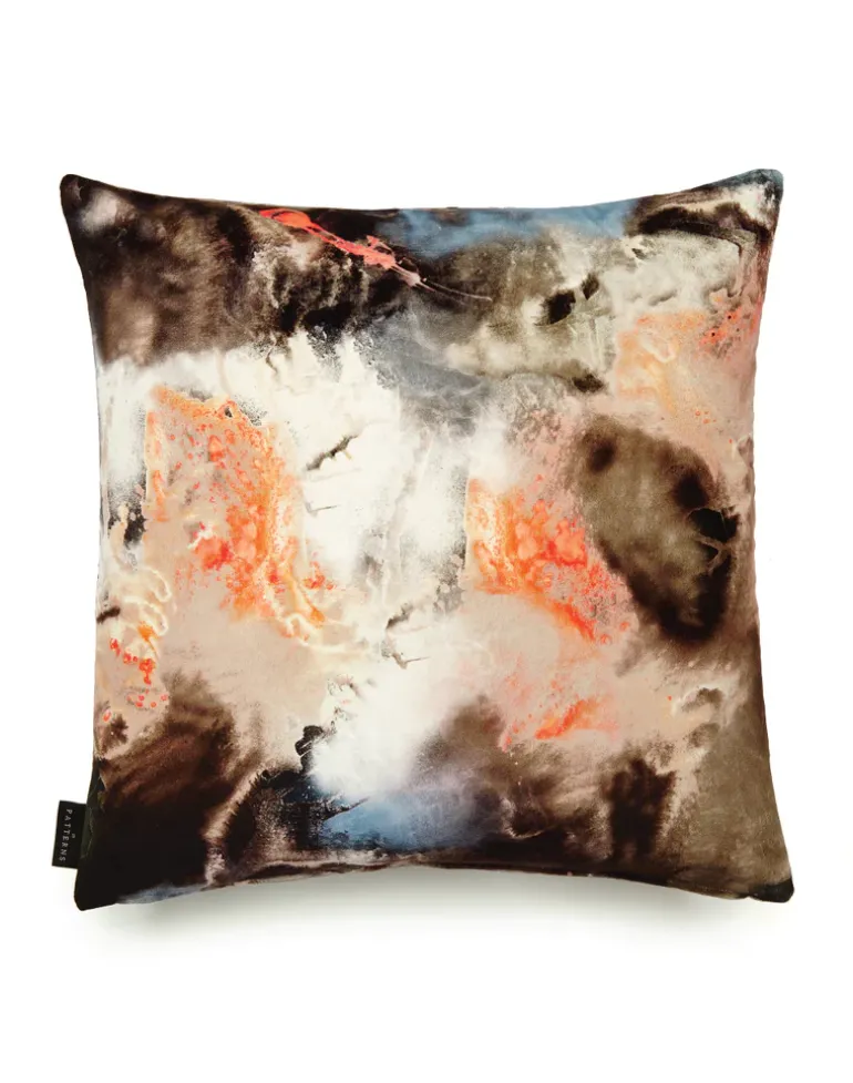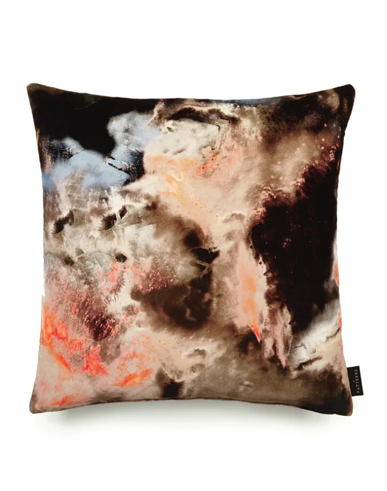 The sublime and opulent Cloudbusting Cushion is a collaboration between British contemporary artist, Paris, and east London designer, Nosca Inc. Delivered in a swirling mist of peach, brown and blue, this alluring cotton velvet cushion displays subtle textures and painting strokes that are organic yet constrained by the repeat of the pattern to create a Rococo-style mirage.