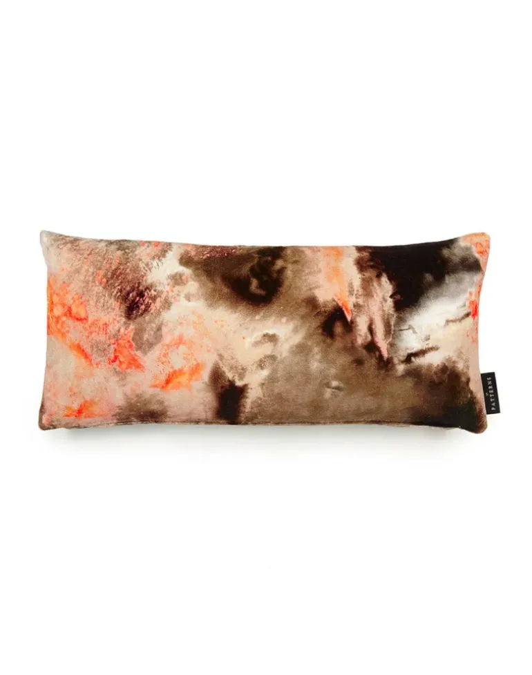 The sublime and opulent Cloudbusting Lumbar Cushion is a collaboration between British contemporary artist, Paris, and east London designer, Nosca Inc. Delivered in a swirling mist of peach, brown and blue, this alluring cotton velvet cushion displays subtle textures and painting strokes that are organic yet constrained by the repeat of the pattern to create a Rococo-style mirage.