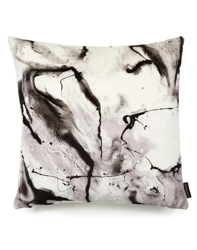 Our Whirling Dervish White Cotton Velvet Cushion showcases a striking abstract painting style to create a marble effect cushion. Lucid, sinuous lines in a monotone palette exhibit a hybrid style of Venetian grandeur fused with urban painting aesthetics.