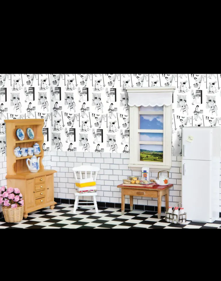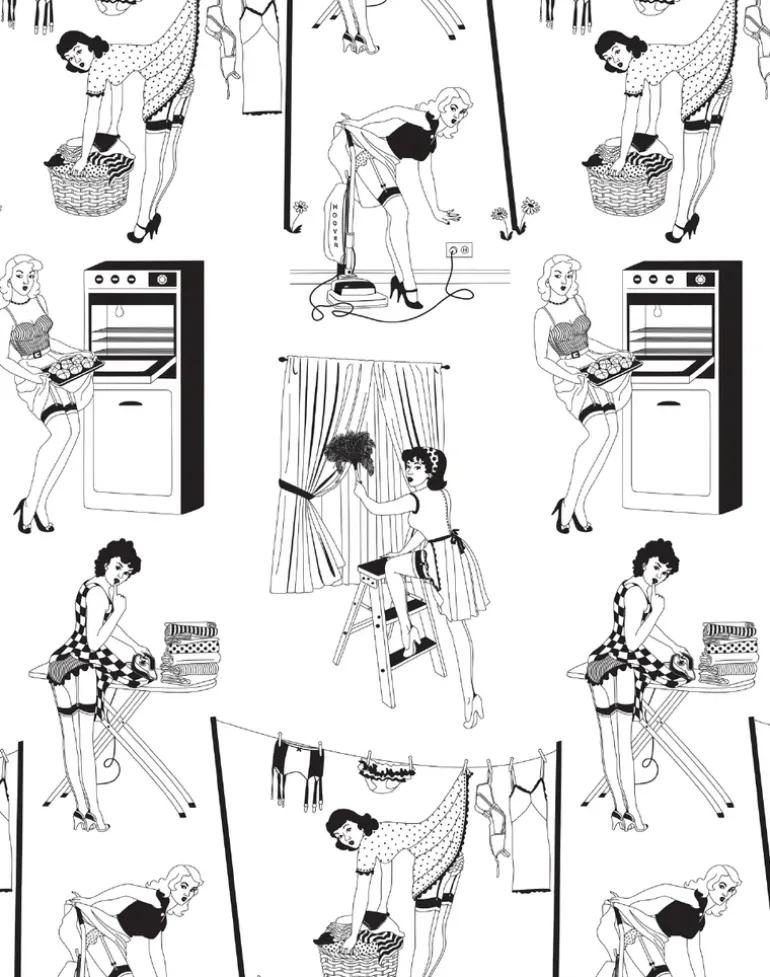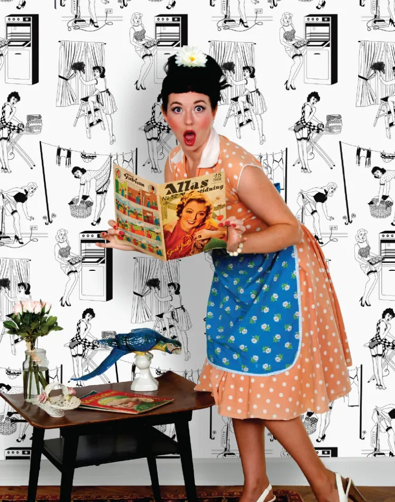 Dupenny’s best-selling retro wallpaper is a take on mid-century Americana, featuring the classic 1950s housewife. This tongue-in-cheek 50s Housewives wallcovering is perfect if you’re looking for kitchen or utility room ideas, or if you would like to inject some fun and personality into your home. Dupenny’s classic black and white palette will compliment any color scheme.