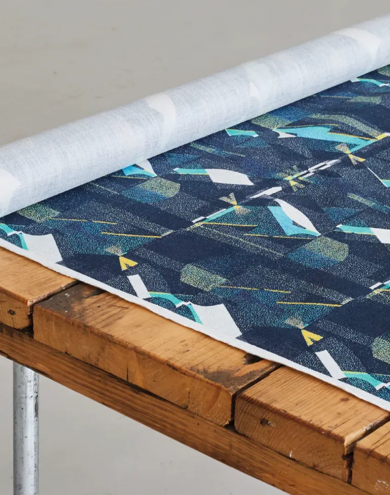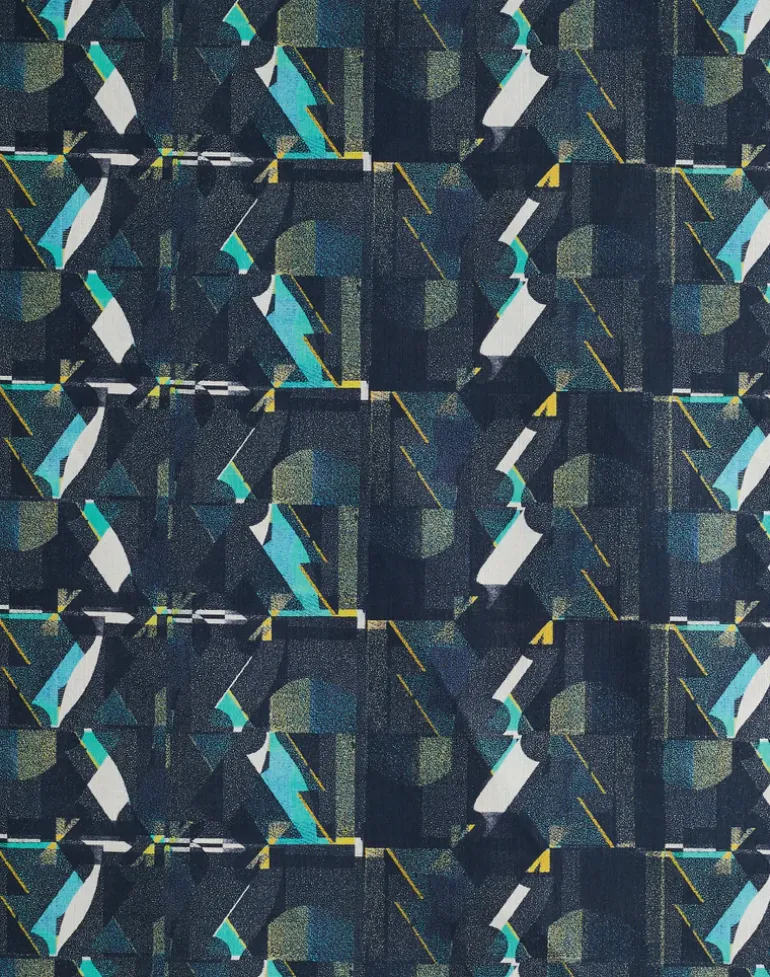 A Shingle Night designed by Touching Elbows for Flock. Digitally printed in a mix of deep indigos and electric turquoises on crisp white linen / viscose.