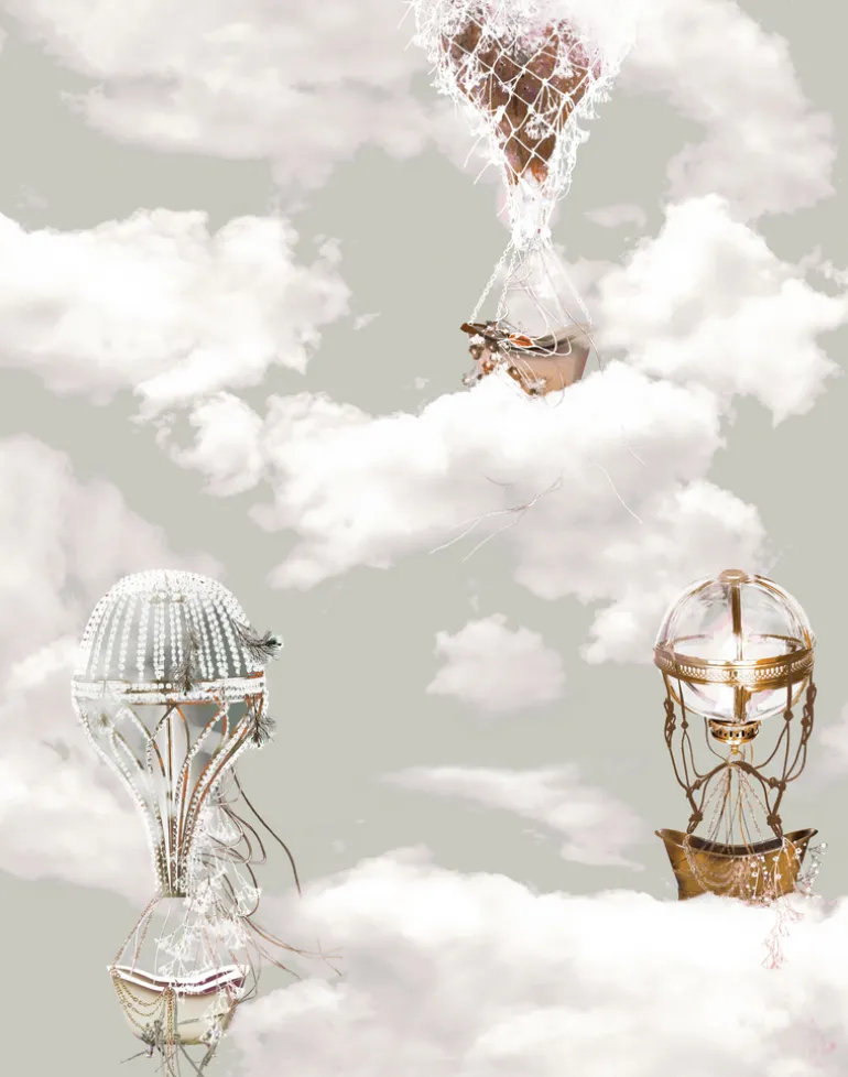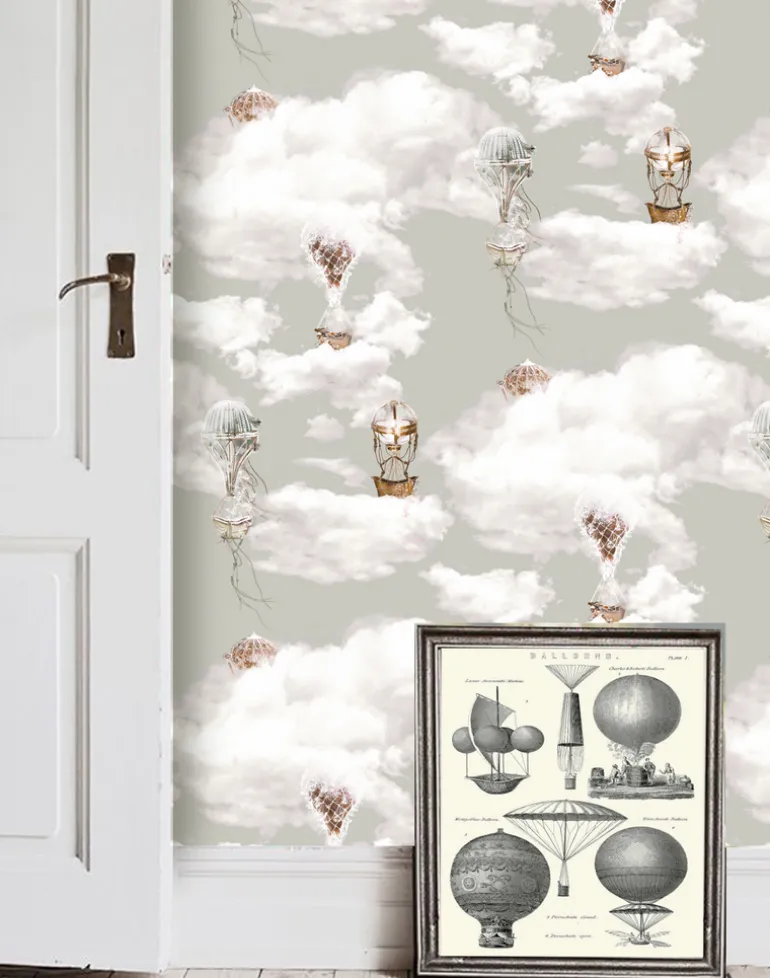 Good & Craft creates innovative, and whimsical patterns that are rich in details and sensual colors. Whimsical hot air balloons float through the sky amongst shimmering clouds. Printed on a pearlescent paper for luxurious shine with a mother-of-pearl effect.