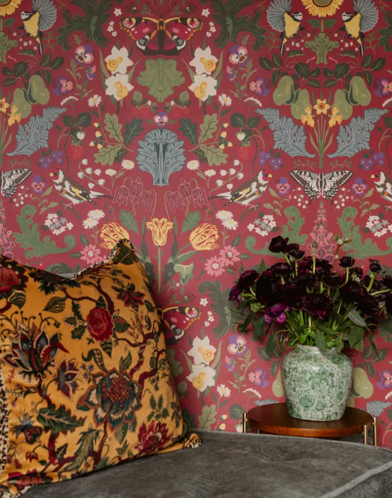 Admiral takes inspiration from the arts and crafts movement, a design of perfect symmetry echoing the beautiful admiral butterflies aesthetic. Set amongst British fruits such as the heritage pear and strawberry plants, flowers such as tulips and daffodils and native birds including the blue tit and the goldfinch all encapsulated in stunning stylized acanthus leaves. Admiral is a modern twist on traditional design. A homage to our favorite designer. Our ‘Berry’ colorway is inspired by British seasonal red berries found abundantly in the hedgerows with traditional head colors to inspire a classic look.
