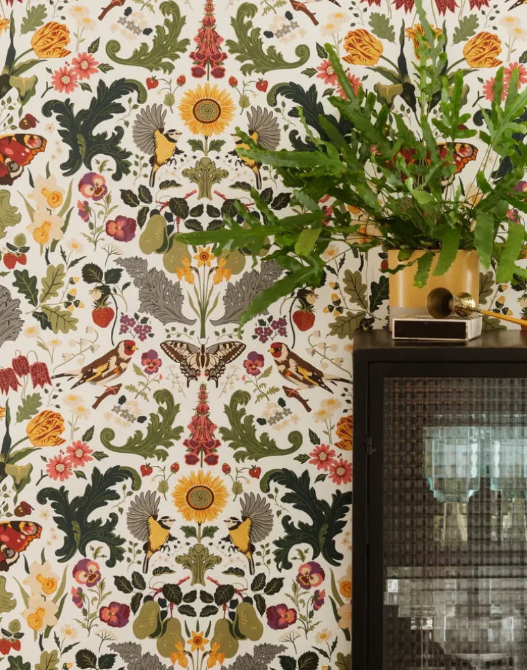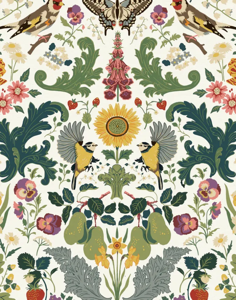 Admiral takes inspiration from the arts and crafts movement, a design of perfect symmetry echoing the beautiful admiral butterflies aesthetic. Set amongst British fruits such as the heritage pear and strawberry plants, flowers such as tulips and daffodils and native birds including the blue tit and the goldfinch all encapsulated in stunning stylized acanthus leaves. Admiral is a modern twist on traditional design. A homage to our favorite designer. Our ‘Berry’ colorway is inspired by British seasonal red berries found abundantly in the hedgerows with traditional head colors to inspire a classic look.