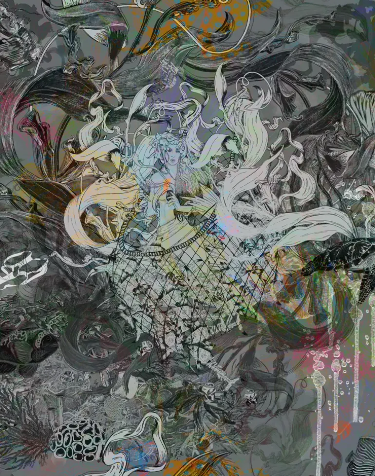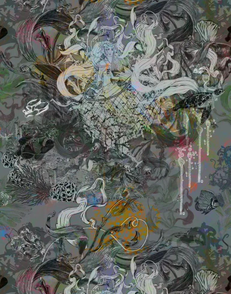 Style up your interiors and instantly add color with our luxury Wallpapers. This enchanting design collection submerges you deep beneath the ocean waves, dive down amongst the intoxicating layers of Adrift to discover the mischief and madness you have come to expect from BOBO1325. For this collection has a dark side, it highlights the effects of plastic and pollution within or waters. Navigate through pieces of pollution to get to the fascinating depths full of vibrant splashes, ocean botanicals, mermaids and sea creatures.