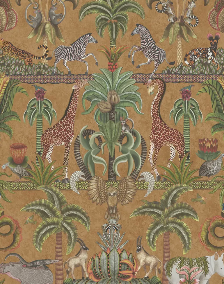 Step into a regal African panorama with Ardmore’s Afrika Kingdom Wallpaper. This exquisite design weaves the vibrant circle of life into your space, featuring mirrored pairs of Africa’s most majestic wildlife amidst lush greenery. Overlooked by a majestic eagle owl and adorned with flourishing palm trees, this wallpaper, available in night sky, high noon, and metallic bronze, transforms any room into an elegant, wildlife-inspired oasis, mirroring the golden hour on the savanna.