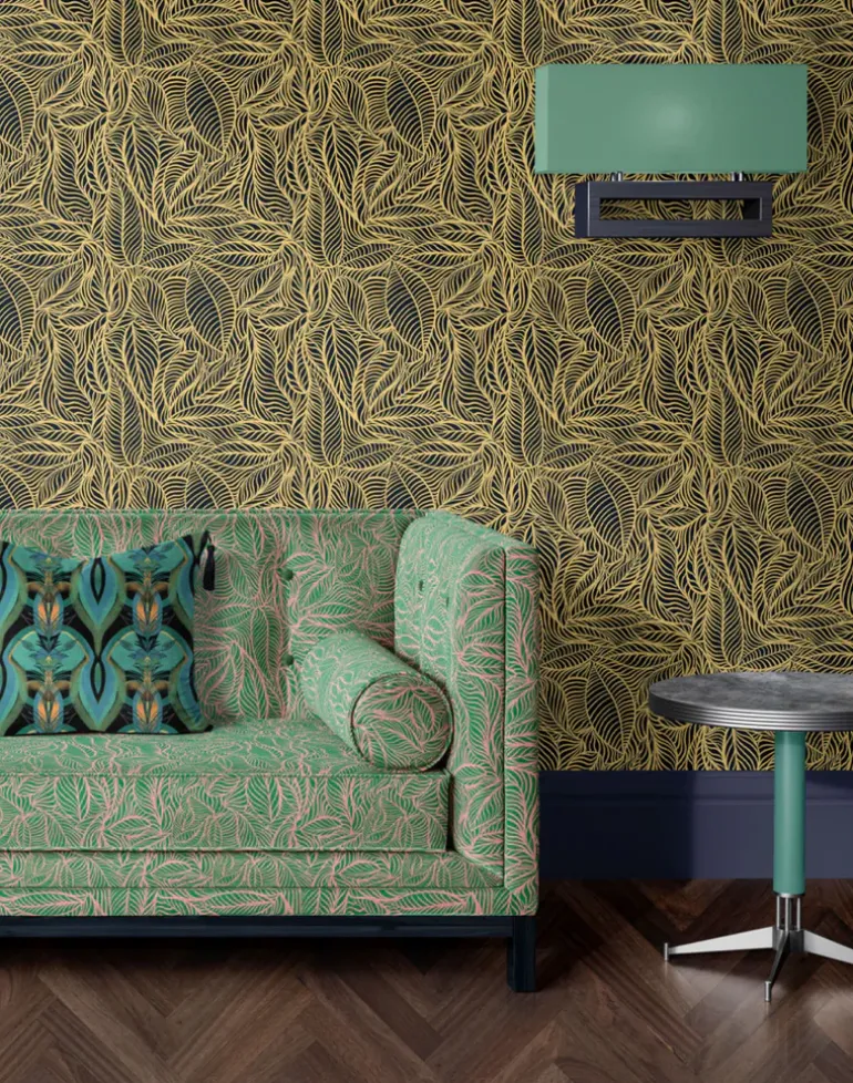 A sumptuous palette of black and gold printed onto pearlescence coated wallpaper and luster velvet will add a subtle Art Deco glamour to any room.