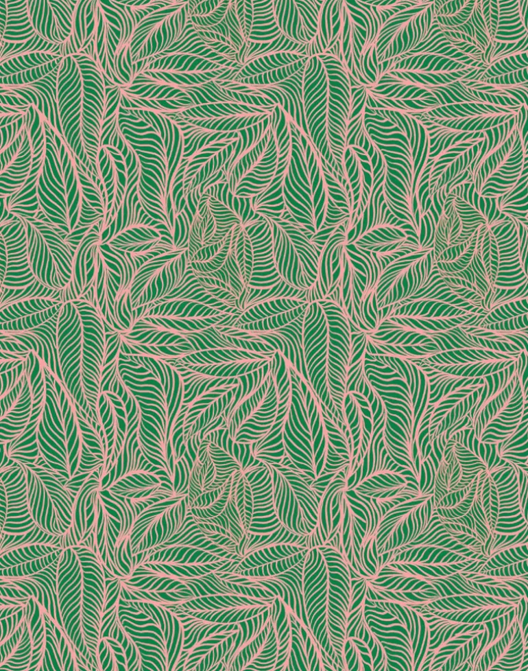 A sumptuous palette of green and pink printed onto pearlescence coated wallpaper and luster velvet will add a subtle Art Deco glamour to any room.