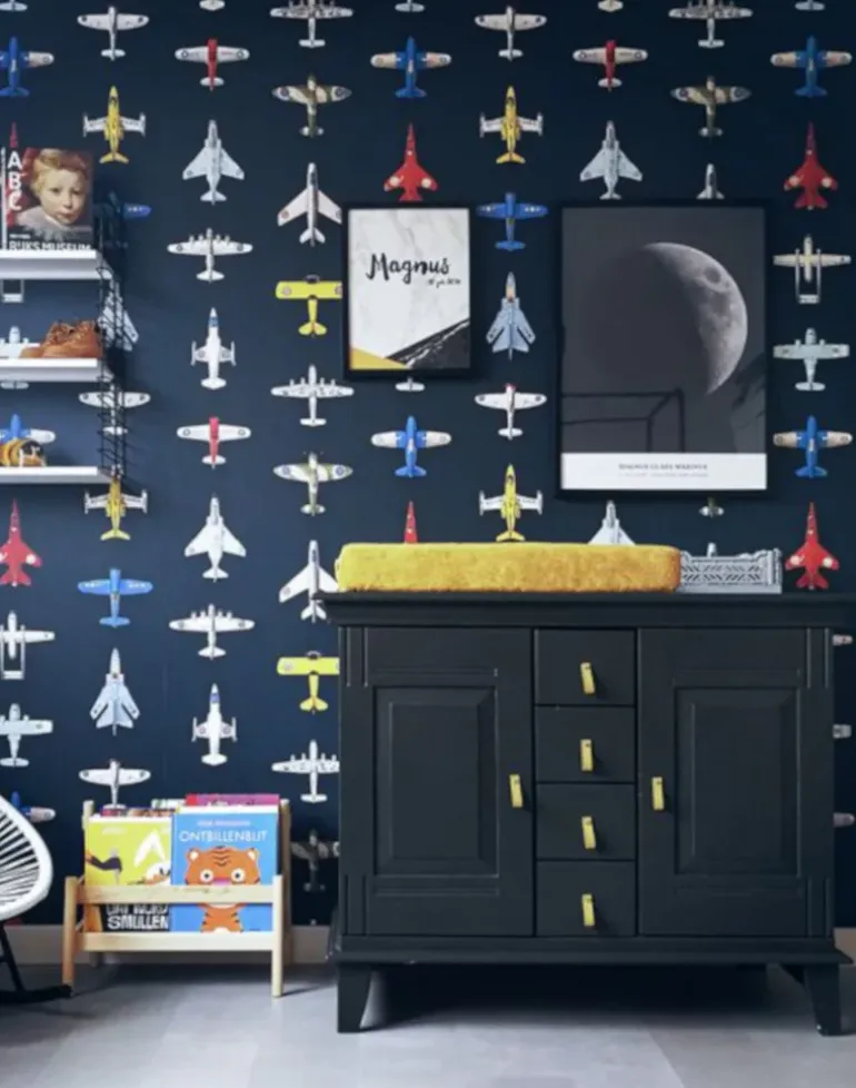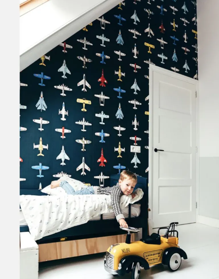 Studio Ditte wallpaper with a sky full of vintage toy airplanes on a dark blue background. Cool wallpaper for the room of young adventurers. Your child boards an exciting flight to unknown destinations.