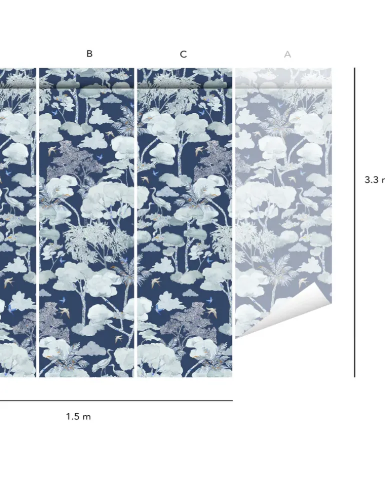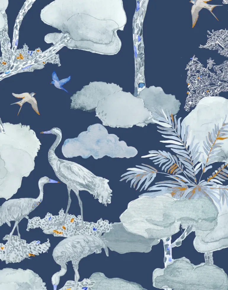 The Aleteo pattern take you on a trip somewhere above the clouds. In between the hills, you can observe cranes and swallows basking on the shore of a lagoon. The delicate watercolor tones give a certain grace and softness to the designs.