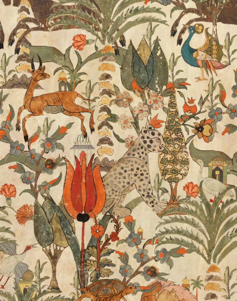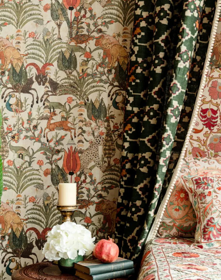 Step into the magical, mountainous landscape of ALGERIAN TALE where native wildlife roams freely amongst desert shrub land and small, ornate architectural landmarks. Tortoises move slowly to the heartbeat of the natural environment and large cats prowl majestically as this enchanting print draws you in, calling you to be at one with the landscape and the lively ecosystems which lie within it. The earthy palette is brought to life with rich, terracotta florals adding a calming ambience to the home.