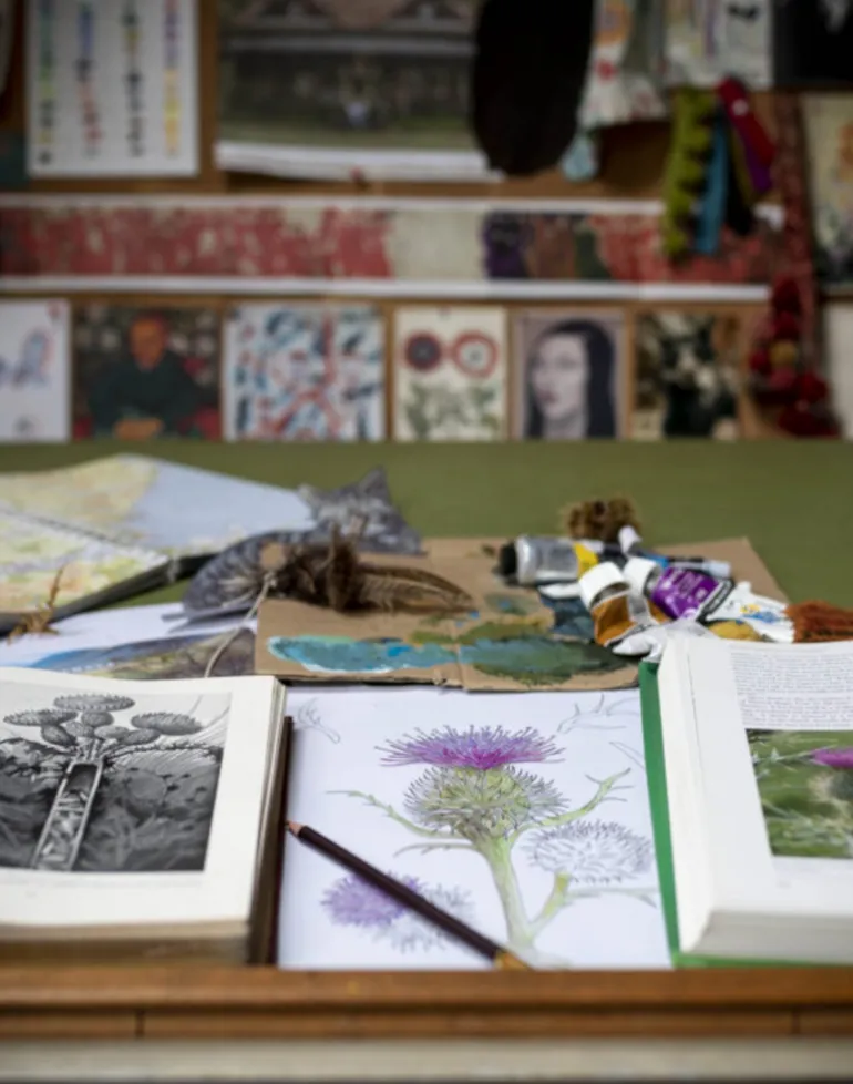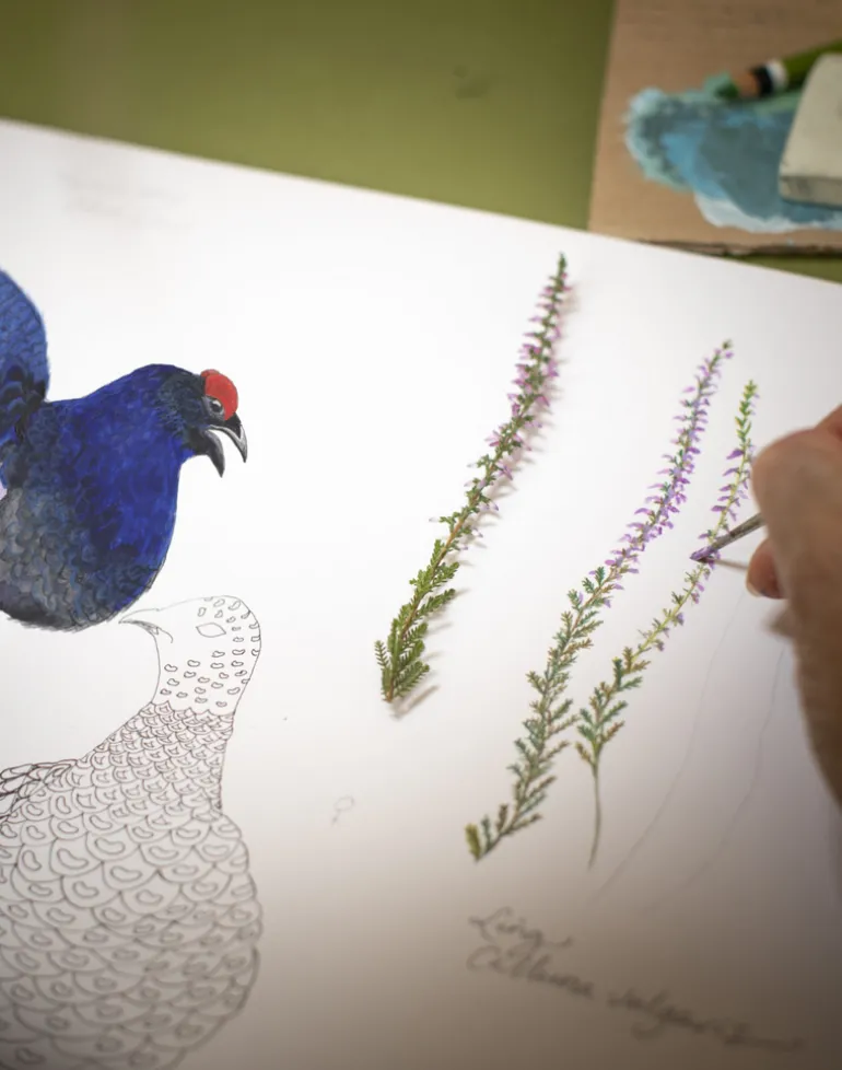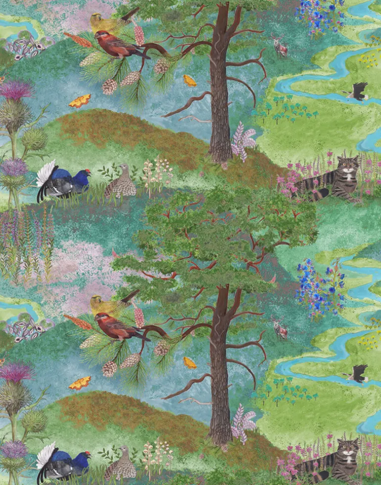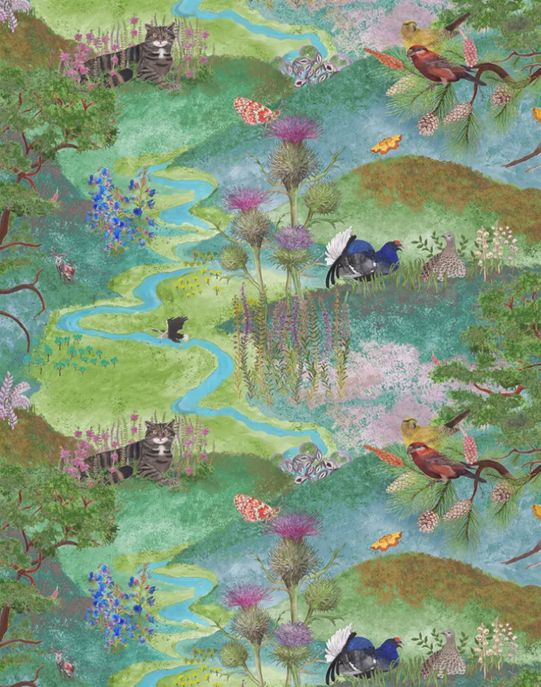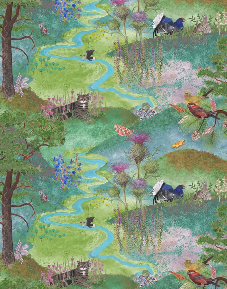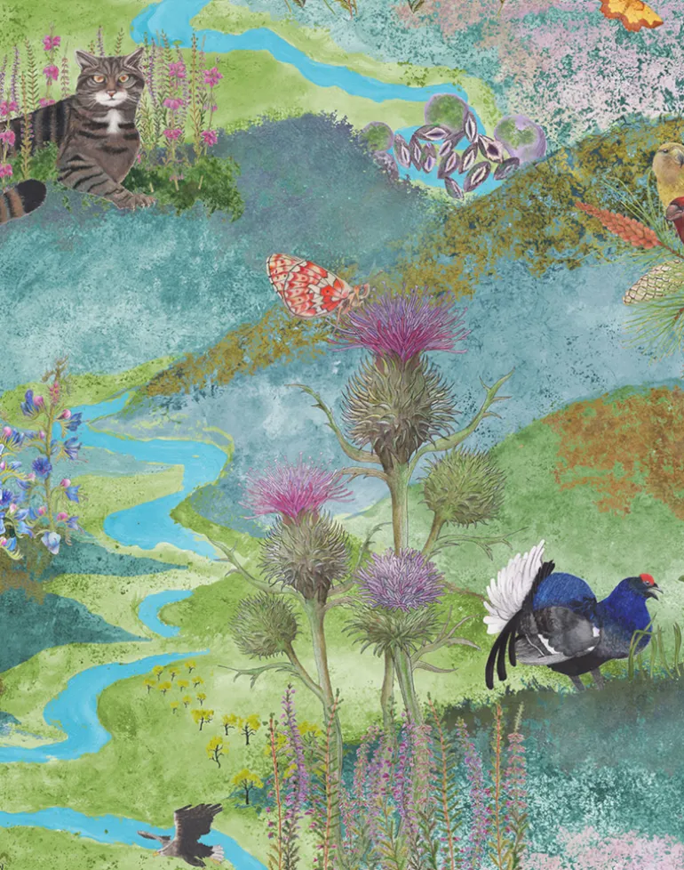 This new design was created as a bespoke design for the the Alladale Wilderness Reserve in the Scottish Highlands, leader in rewiding movement, and recognised as Europe’s most eco-friendly hotel by the recent Boutique Hotel Awards. The design features endangered species such as white-tailed eagles, pearl-bordered fritillaries and Scottish wildcats, which Alladale is actually helping to breed. Other iconic elements include heather, Spear thistle, and black grouse. Handsome Dan, their most spectacular resident Red Deer also makes an appearance. A towering Caledonian pine is home to a pair of Scottish crossbills, the only British bird found nowhere else in the world. The Alladale River meanders through this rolling scenic design which builds upon the current passion in interiors for honouring the natural world. Available as wallpaper, printed linen and, soon, as a velvet.