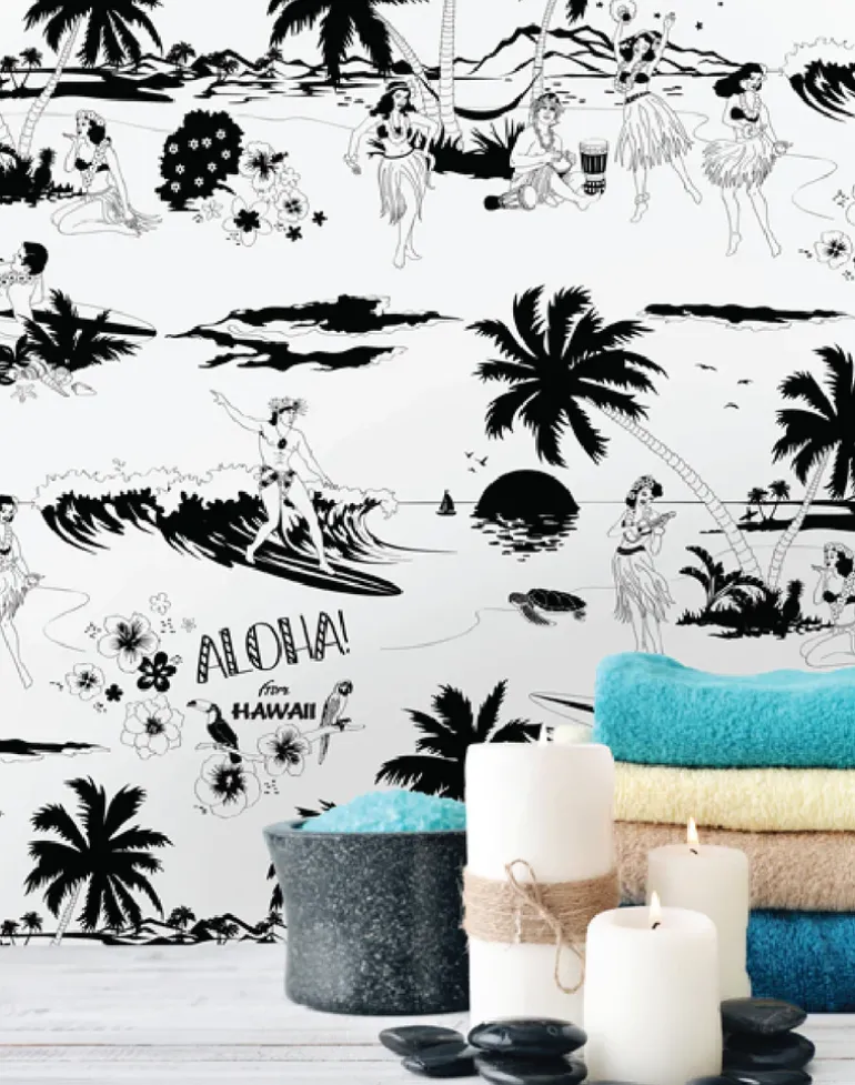 Whoa, Lucy! It’s hotting up in here… Get me a drink with one of those little umbrellas in it… This Hawaiian themed tropical wallpaper is a sure way to heat up any room. Don’t forget to bring the bongos!