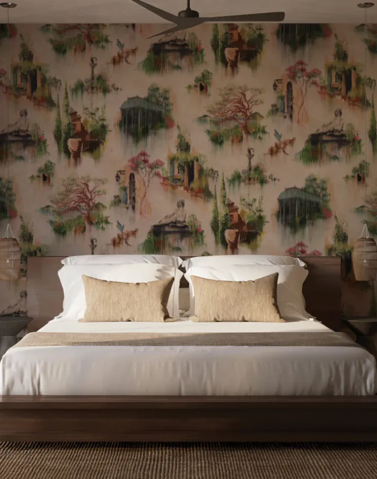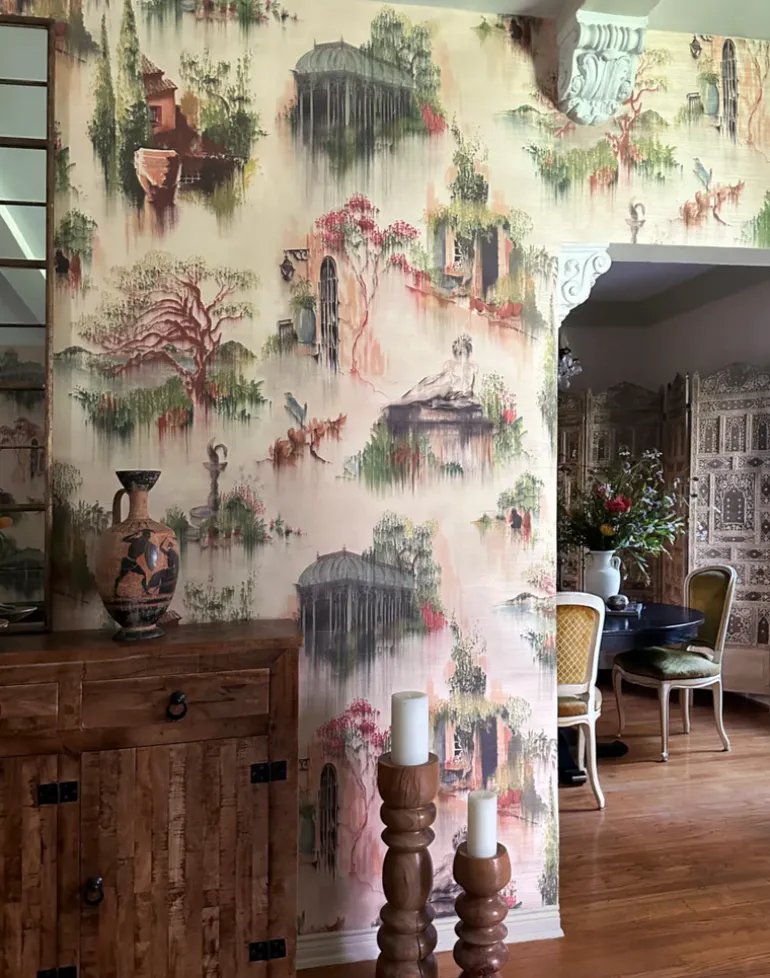 Danica Andler drew the Amelia wallpaper as a secret garden daydream. A menagerie of what she figuratively collected as the most beloved elements of life in an idyllic, Mediterranean climate. All of this artwork began as soft pastel drawings, referencing photographs and memories she has from the South of France and Southern California.