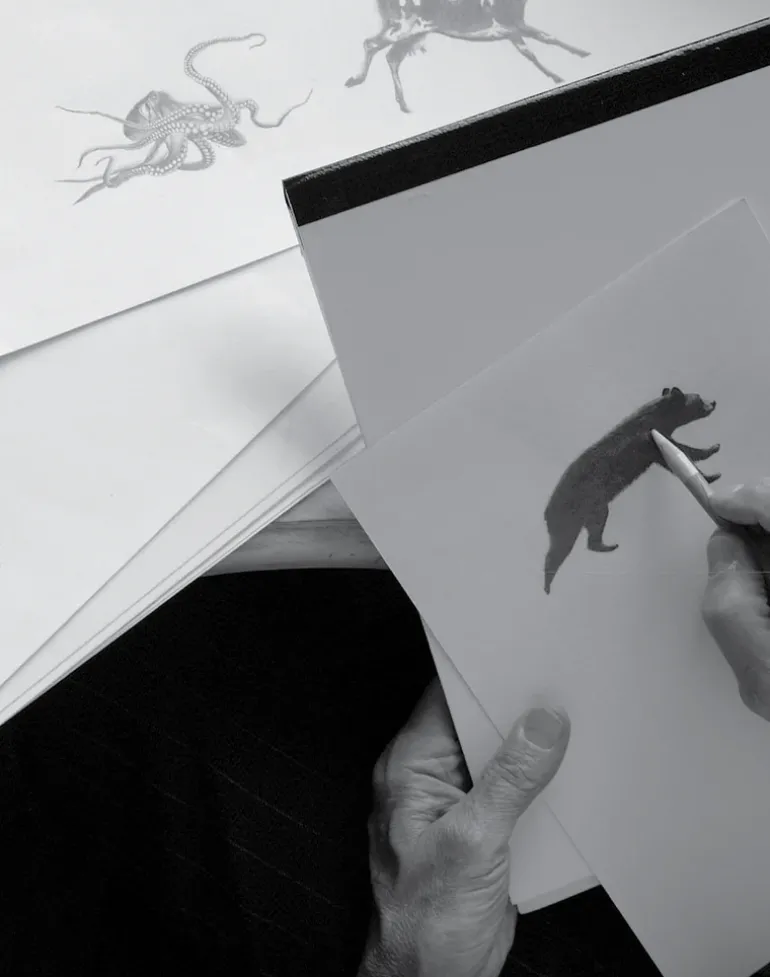 51 animals running together from all walks of life, from the Pacific giant octopus to the farmyard hen. Hand-drawn in pencil over a twelve month period in near-photographic detail by John’s fair and ageing hand (he didn’t know he still had it in him).