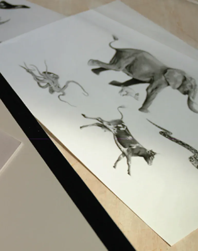 Everything begins with a traditional approach in the studio – hand-drawings, intricate cut-outs, pencils, rubbers and airbrushes. Prototypes go to the print house where specialists are squeezed and cajoled until delicious wallpaper emerges. We hand printed heavy glitters for the first time in the industry (a process that took months to perfect); blended iridescent pigments that change color as you walk by; drew detail so relentless that a single design took a year to complete; and we pioneered the holographic undercoats and 3-Dimensional foils now commonplace across the industry. We won’t mention the endless hair-brained experiments that have yielded nothing but an anti-climax and empty pocket.