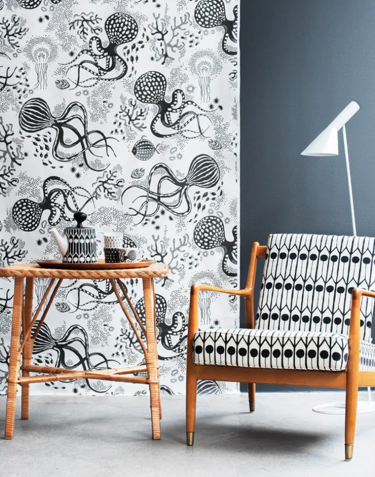 The Aquatic print is inspired by the Sardinian sea, where the great ballet dancers of the Mediterranean waters preform amazing acts. Accompanied by corals, shells and the flow of the ocean creating the rhythm.