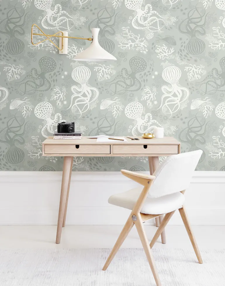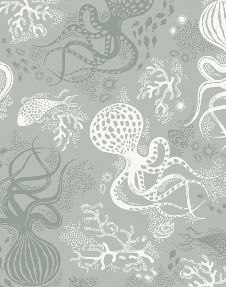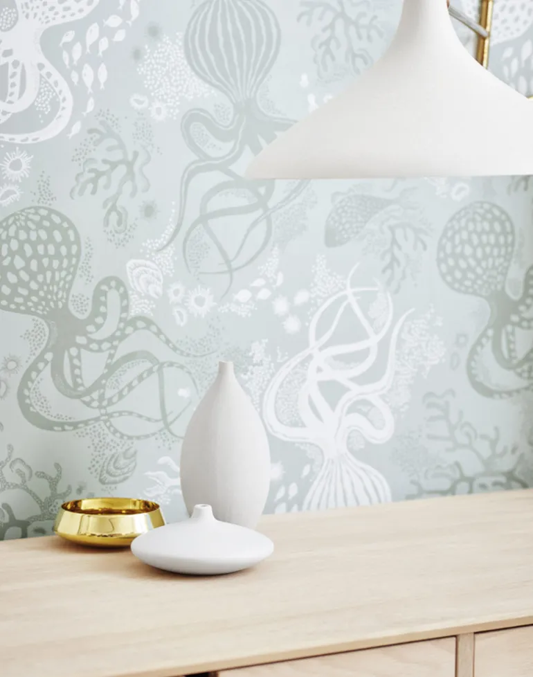 The inspiration for the wallpaper Aquatic comes from the salty waters of the Mediterranean with its white sand and the fantastic creatures that live there. The pattern takes you on a journey from the Amalfi Coast to the French Riviera and breathes both sea tones and stylish graphic rhythm.