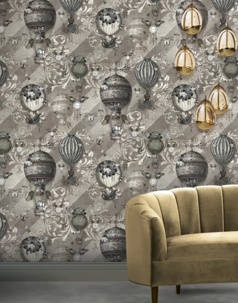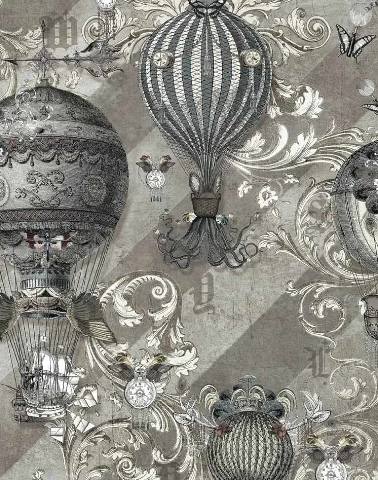 Travel the world in style with this bold print featuring vintage hot air balloons and antique pocket-watches. You’ll pass through land, air and sea in this immersive ivory design alluring the feeling of wanderlust within. With its subtle evanescent background set against the intricate foreground, this wallpaper adds depth and adventure to any room.