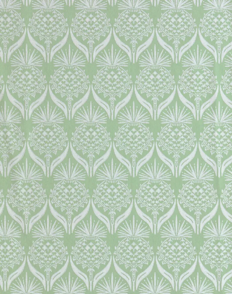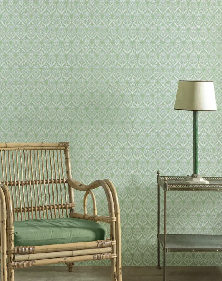 A small-scale repeat of golden Palm trees, available in an elegant midnight blue or a soft gold on parchment.