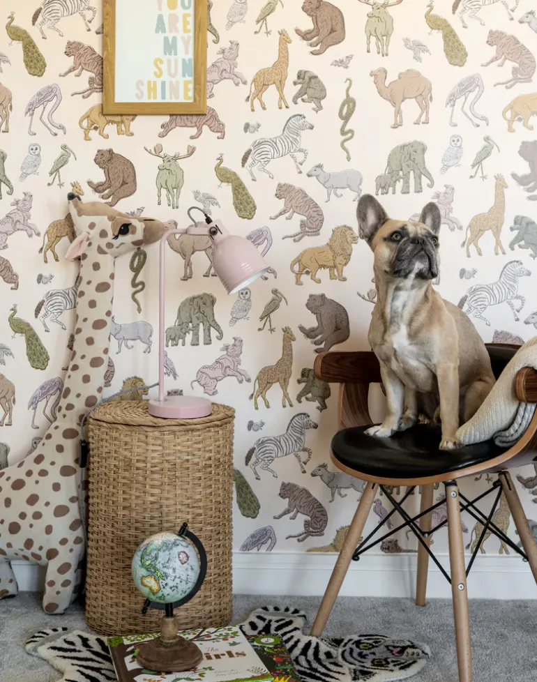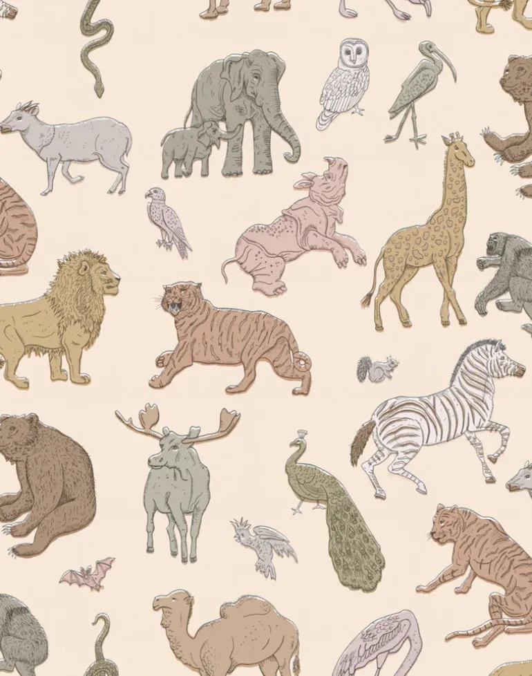 Assemble Wallpaper in Cashmere. The assembly of our favorite wild beasts, all in one place. Assemble is a hand drawn line-drawing featuring an infamous ensemble of wildlife including bears, giraffes and flamingos! Digitally printed and willfully off set to give the hand-made crafted feeling of screen printed paper. This charming paper is so fun, playful and full of personality. Created in a palette of warm neutral shades to evoke softness. Brilliant for big kids as well as the little ones!!