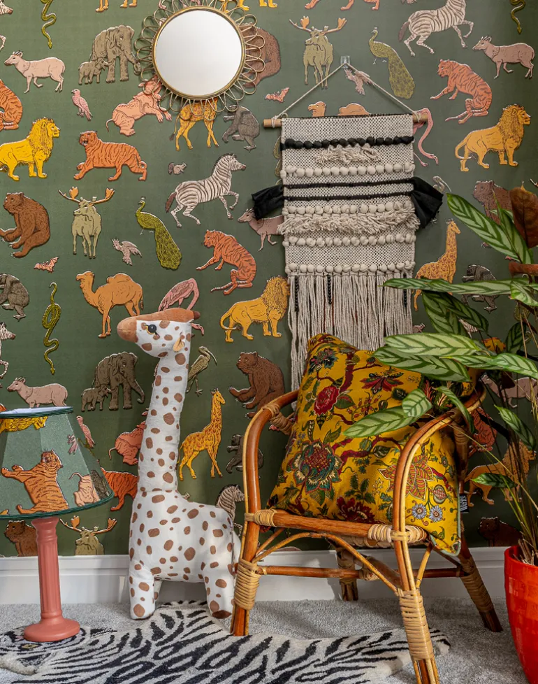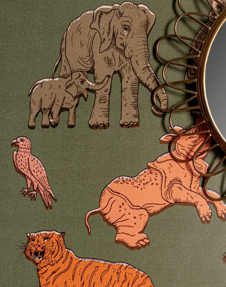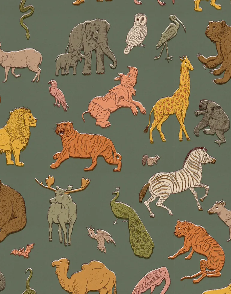 Assemble Wallpaper in Khaki-Green. The assembly of our favorite wild beasts, all in one place. Assemble is a hand drawn line-drawing featuring an infamous ensemble of wildlife including bears, giraffes and flamingos! Digitally printed and willfully off set to give the hand-made crafted feeling of screen printed paper. This charming paper is so fun, playful and full of personality. Created in a palette of safari inspired shades including taupe, khaki and earth. Brilliant for big kids as well as little ones!!