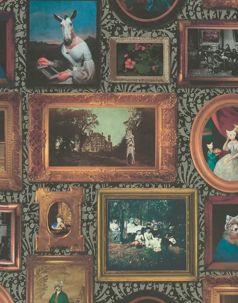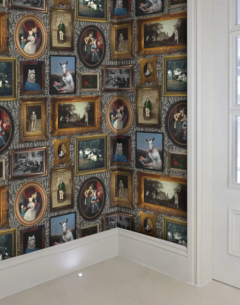 “The art gallery wallpaper contains a background created from an original 19th century, intricately carved wooden wallpaper block that Charlotte has had hanging above her printing press. The collection of paintings featured in the wallpaper are original works of art by Charlotte. Several of these work have been shown at the Royal Academy Summer exhibition, with the the Lady Wolf portrait ̴ being exhibited at the 2019 Summer Exhibition. A wonderful way of having a handsomely framed paintings on your wall.”