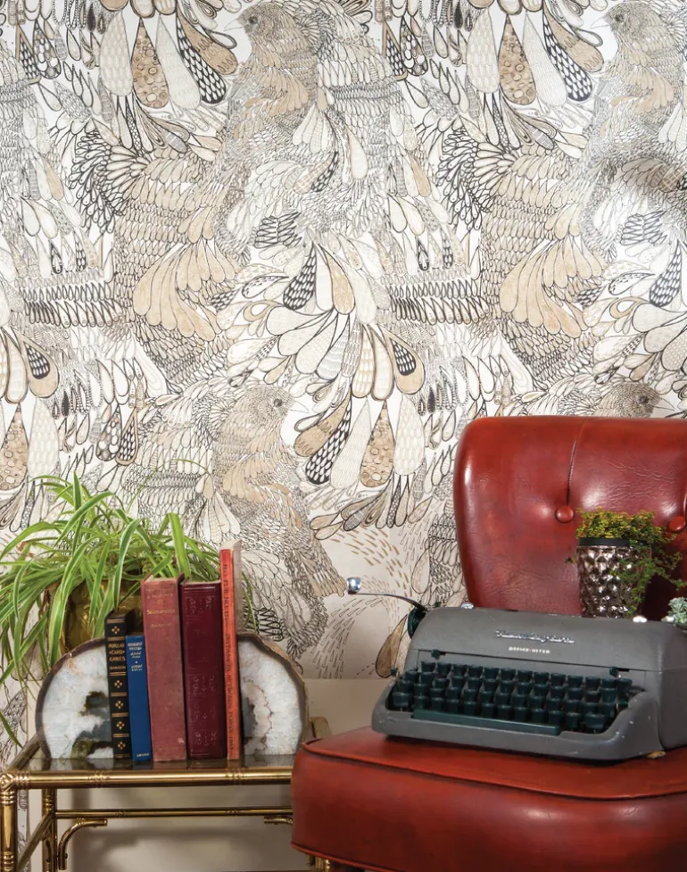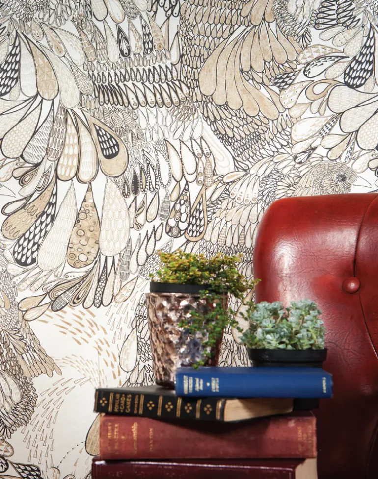 Digitally printed repeat wallpaper, featuring an organic bird motif built up using highly detailed repetitive patterns.