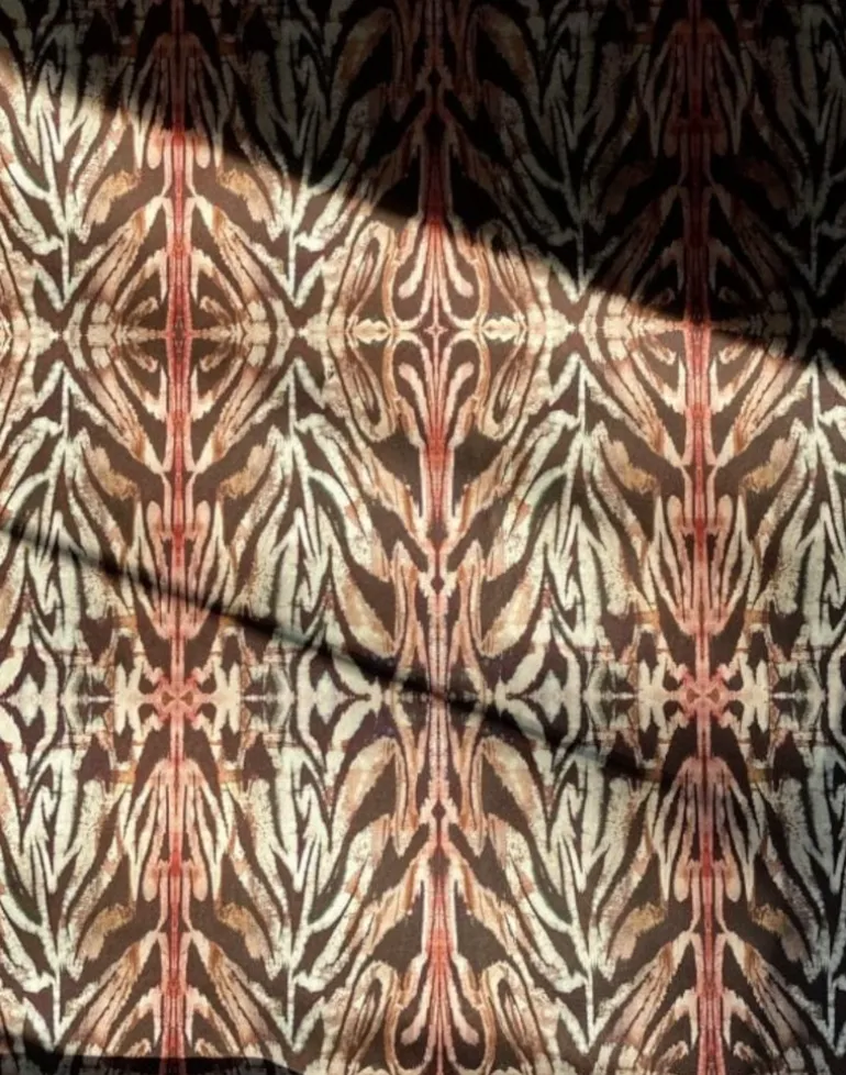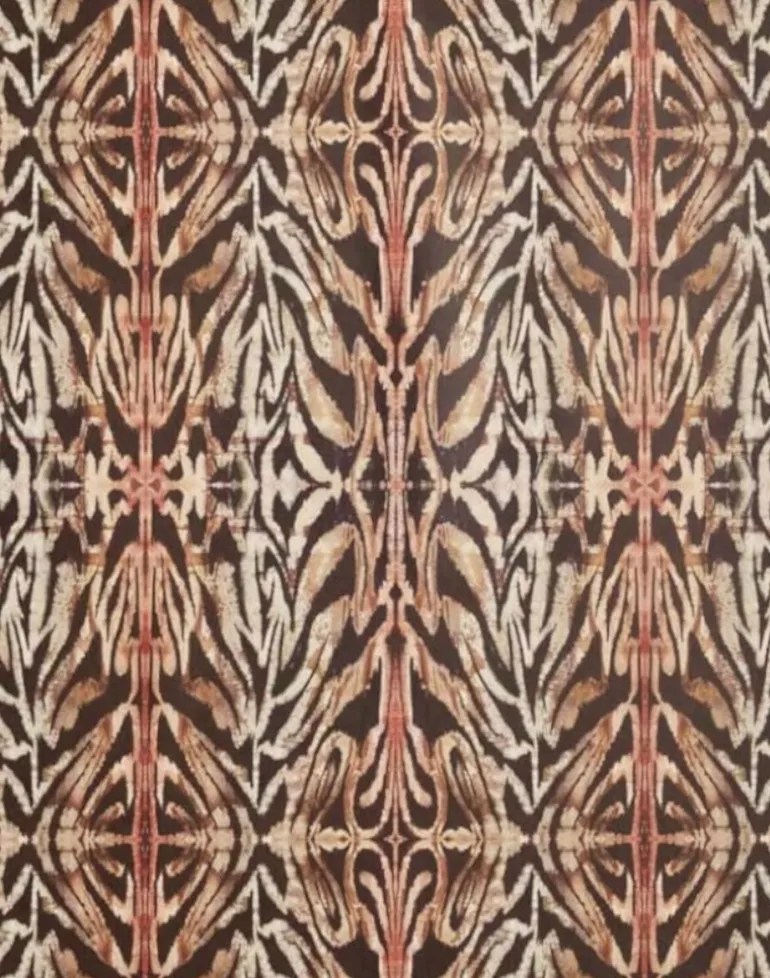 BamBam is a vivid new animalesque design hand painted by Anna. Warm pinks, soft black and cream tones mingle to form a tribal, detailed design with a cozy luxurious vibe.