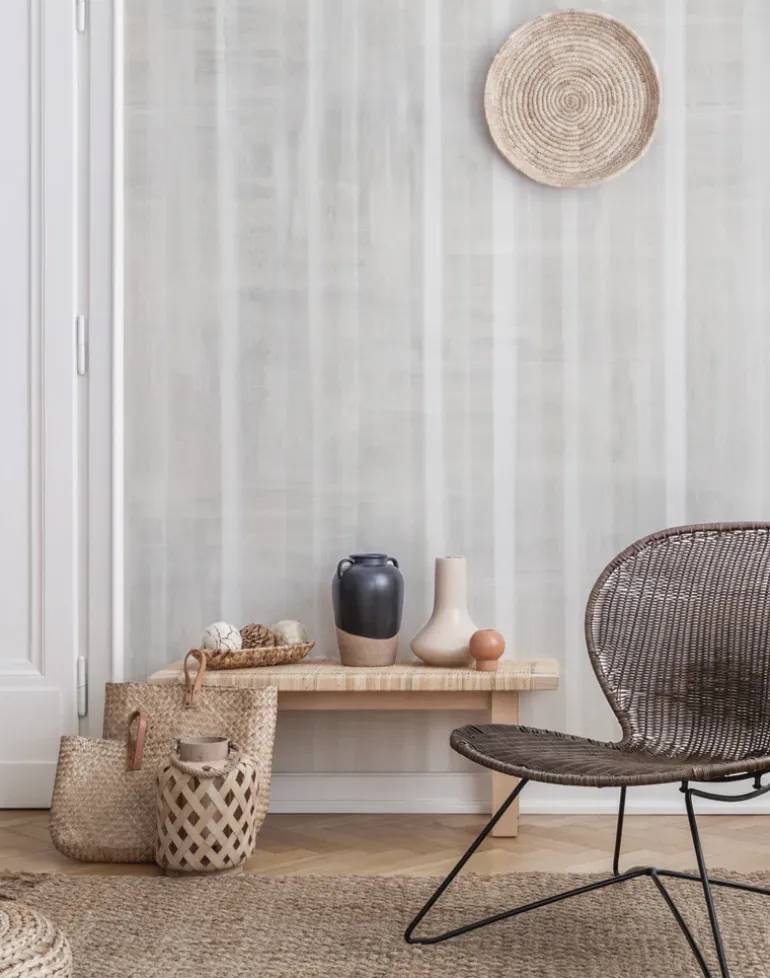 Like bands of light, painted brushstrokes are overlaid to create vertical streaks of light and dark. Nuance, subtlety and linear movement make this mural a versatile backdrop.