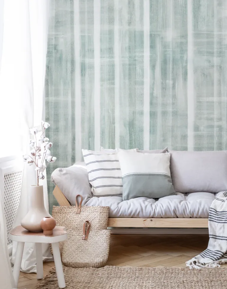 Like bands of light, painted brushstrokes are overlaid to create vertical streaks of light and dark. Nuance, subtlety and linear movement make this mural a versatile backdrop.