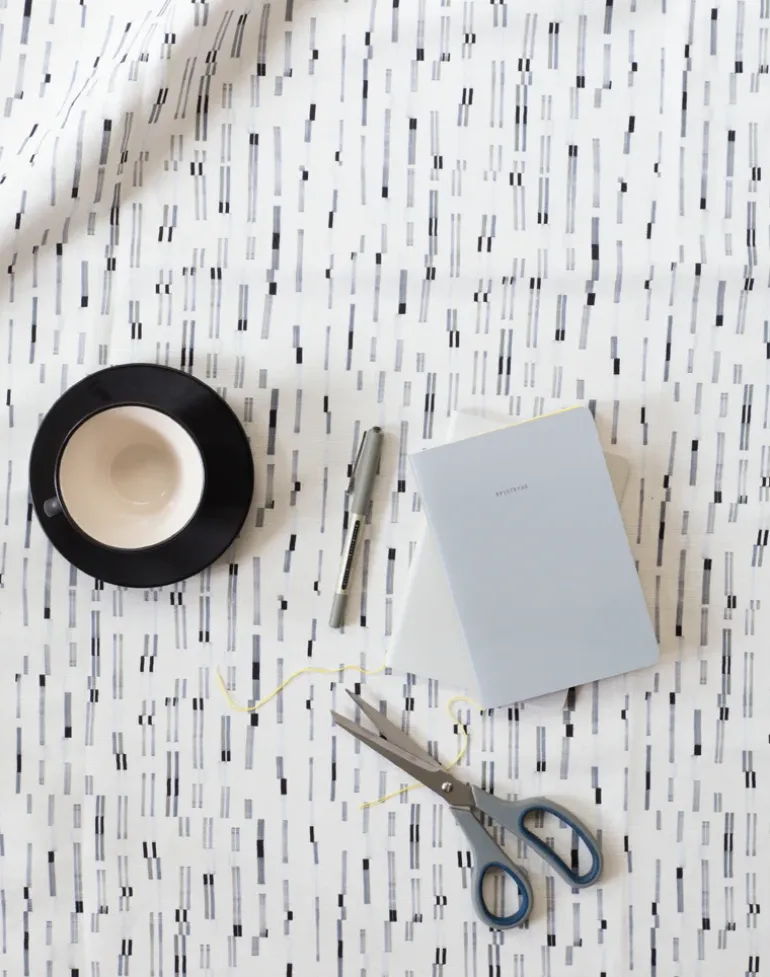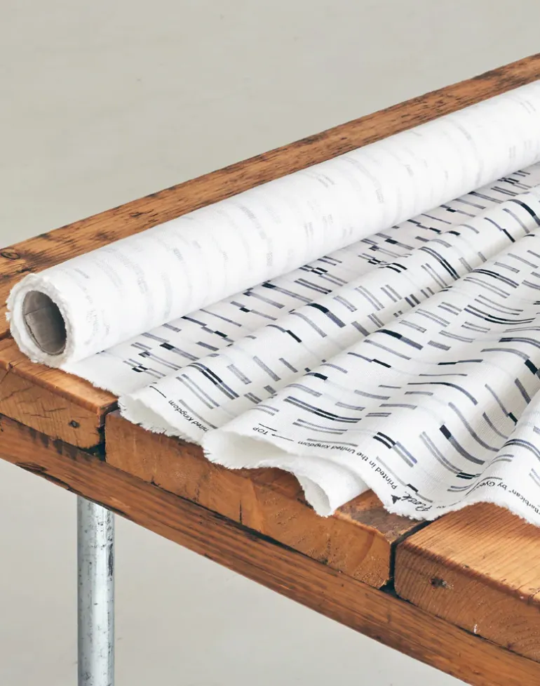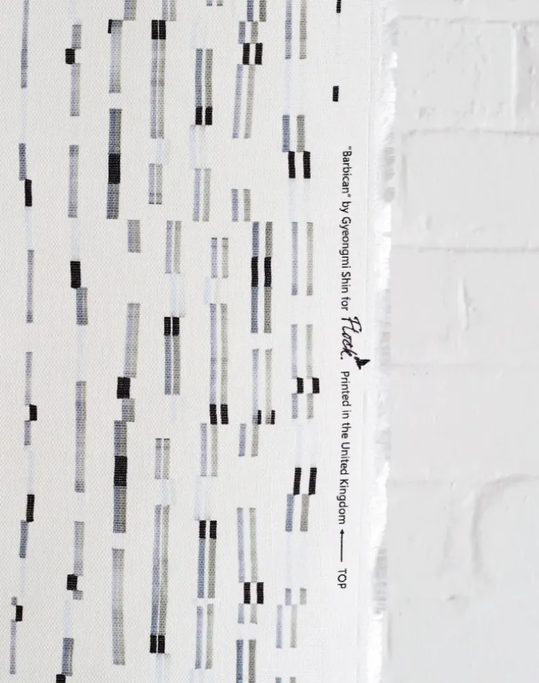 Barbican designed by Gyeongmi Shin for Flock. The pattern is digitally printed in a beautiful mixture of greys and inks on a crisp white linen/cotton blend.