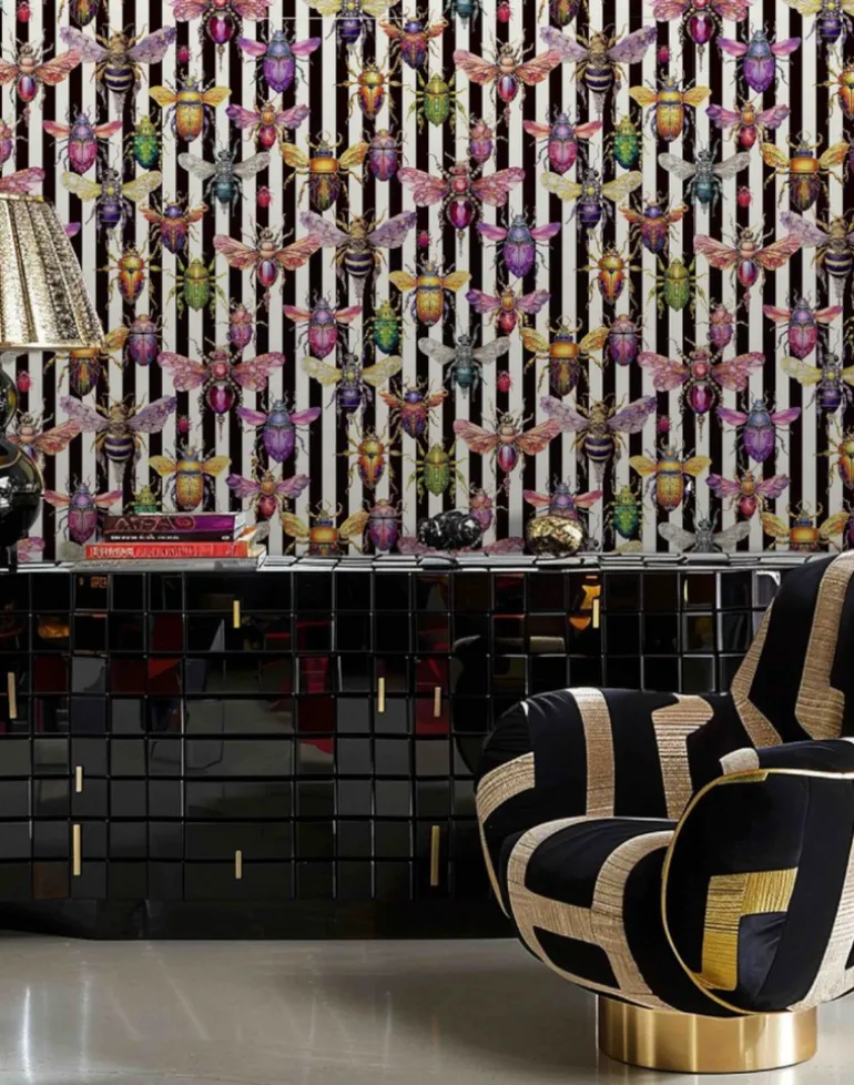 This maximalist stripe wallpaper is home to an array of stunning bejeweled bugs. Diamonds, rubies, and emeralds bring a radiant glow to these enchanting creatures, creating a mesmerizing, unusual wallpaper. It’s captivatingly beautiful and will most definitely get everyone talking! is a dramatic design that brings the beauty of jewels into your home. Perfect for a feature wall.