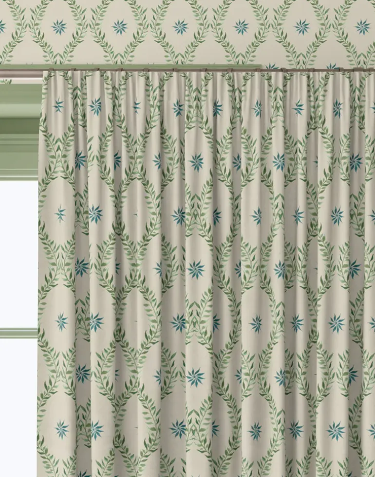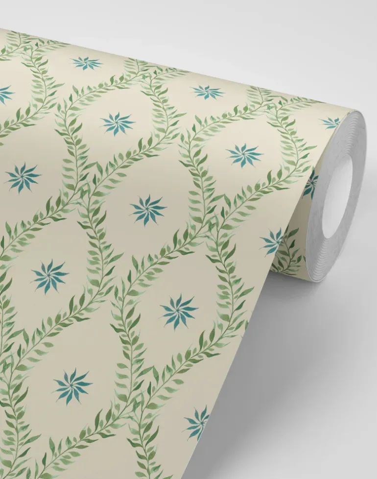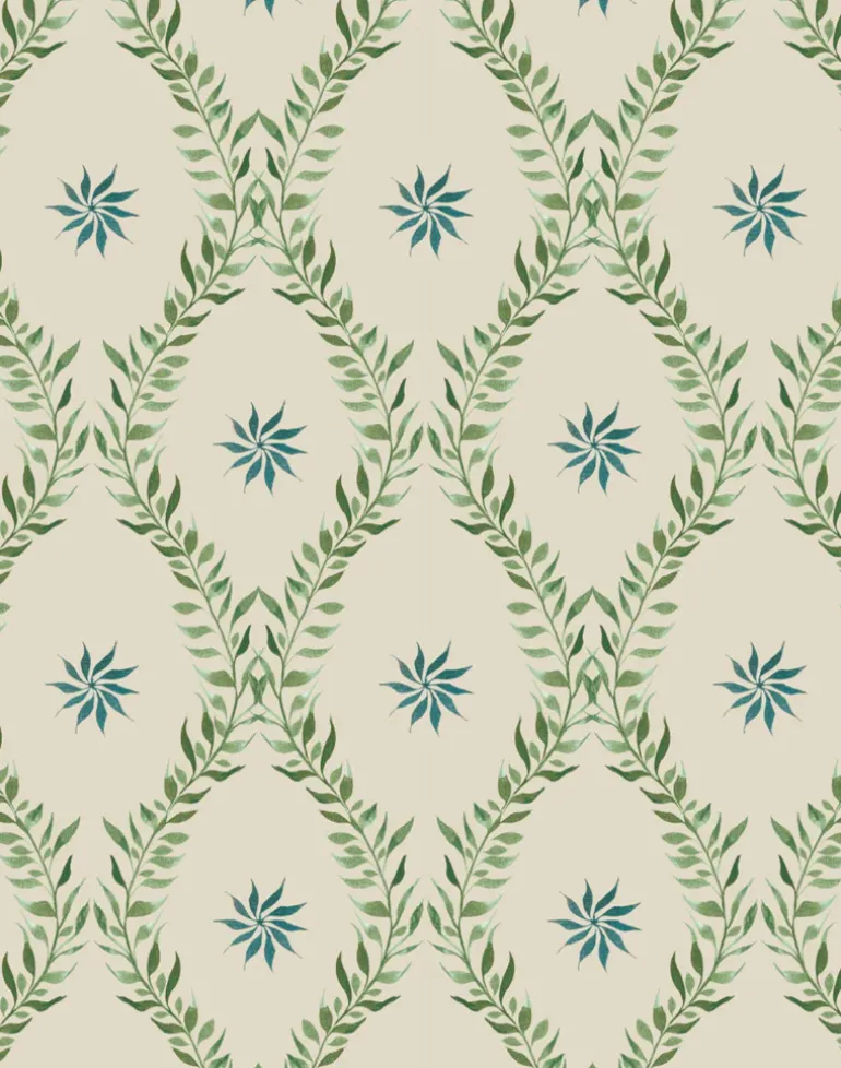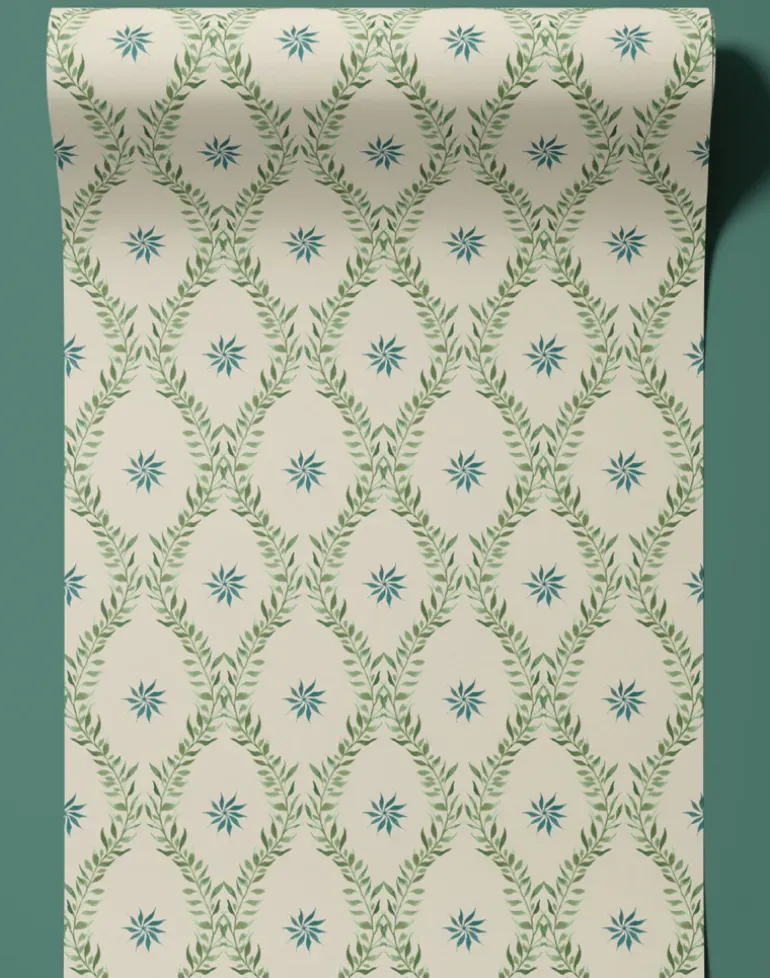 Hand-painted using Japanese inks, Belle’s classically inspired, diamond-shaped pattern exudes elegance in its uniform simplicity – but not all is as it seems. Step closer and the print’s gentle, leafy vines reveal themselves as they organically unfurl across the progressive design.