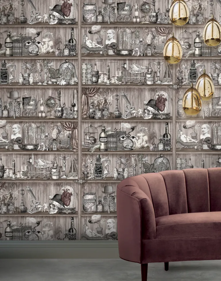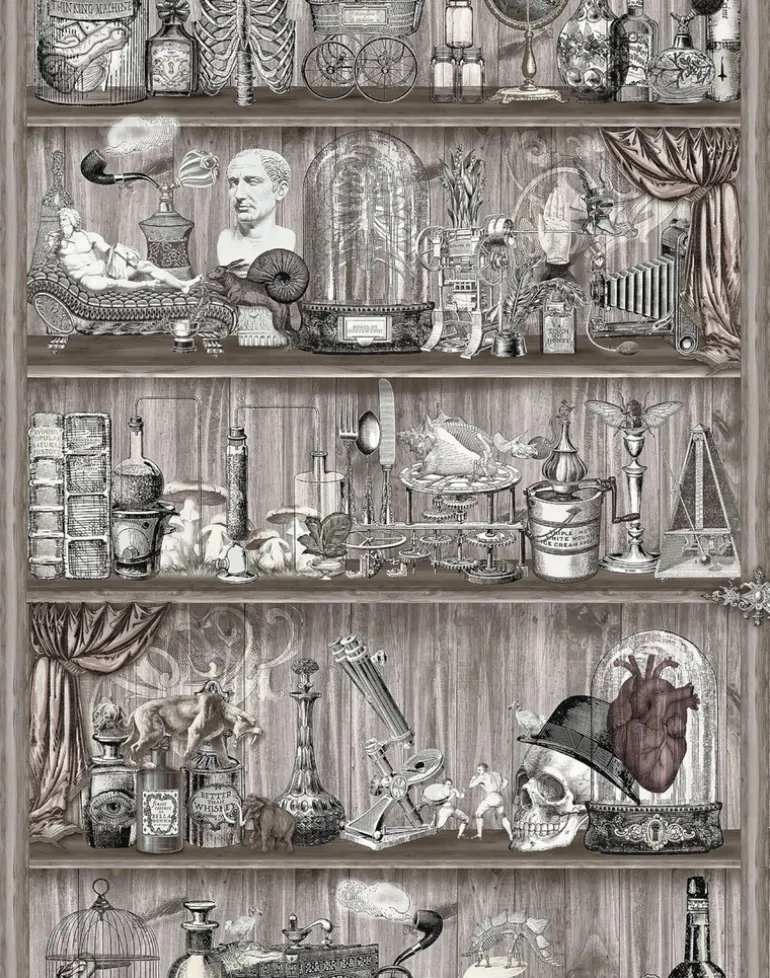 Welcome to the world of the weird and wonderful with this curious collection of tiny trinkets and outstanding ornaments. This library of surprises was collated by sorcerers past and present and delves into the mysterious minds of scientific discovery. The ash theme brings an antique appeal to this wallpaper, which when mixed with modern meddling’s adds interest to any room.