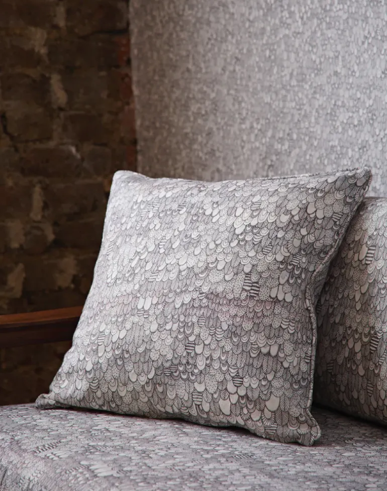 Each feather that makes up the ‘Bird’ fabric design has a layered watercolour base and is hand drawn in pen. The fabric is inspired by the many varied patterns in the feathers of both the male and female pheasant and is designed to create a subtle textural effect. Digitally printed in the UK on dew retted UK linen