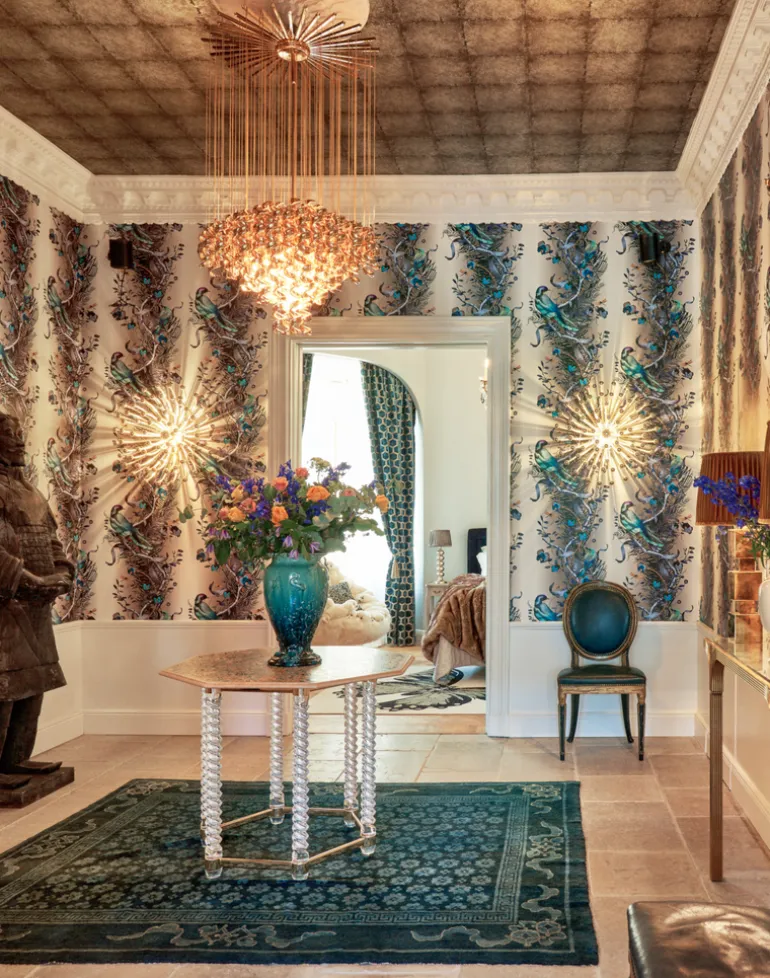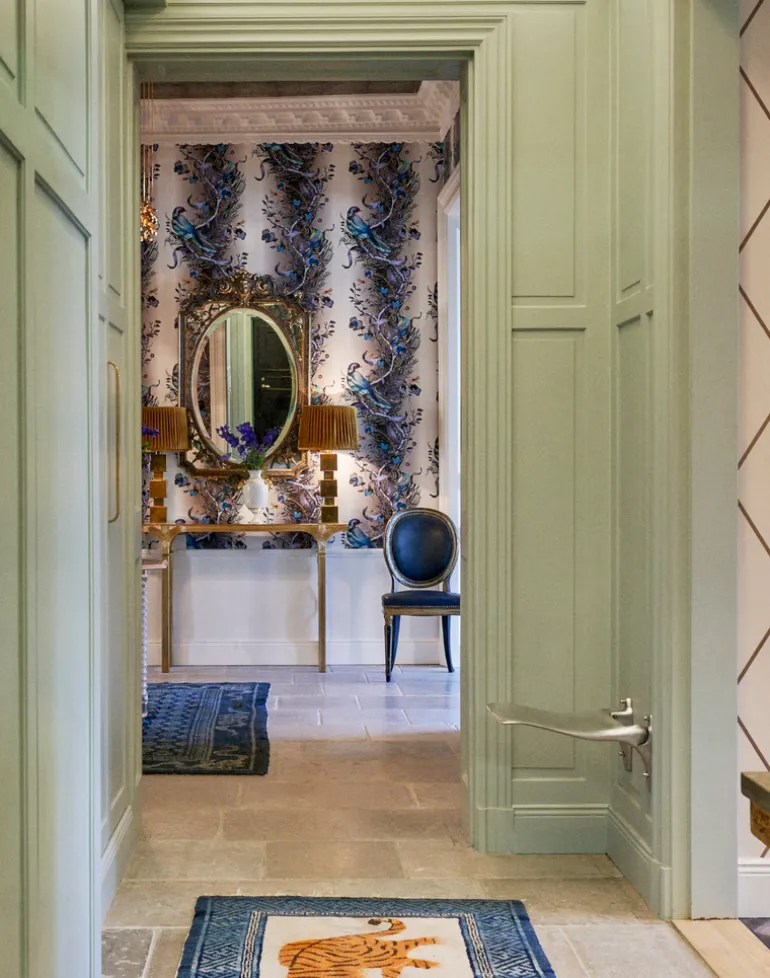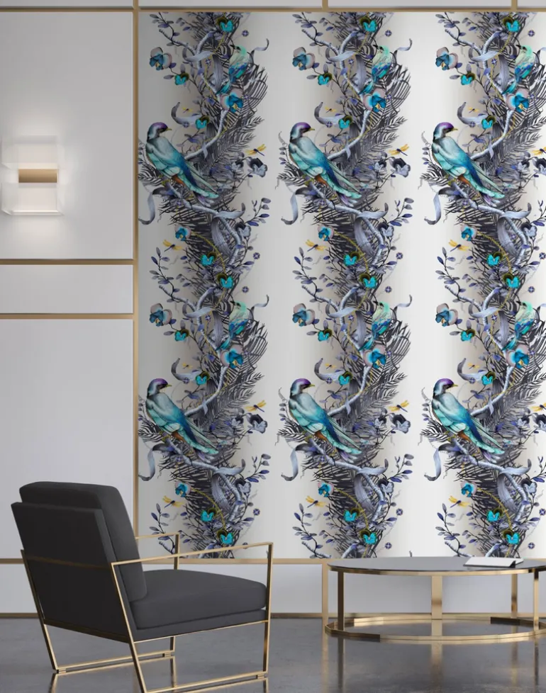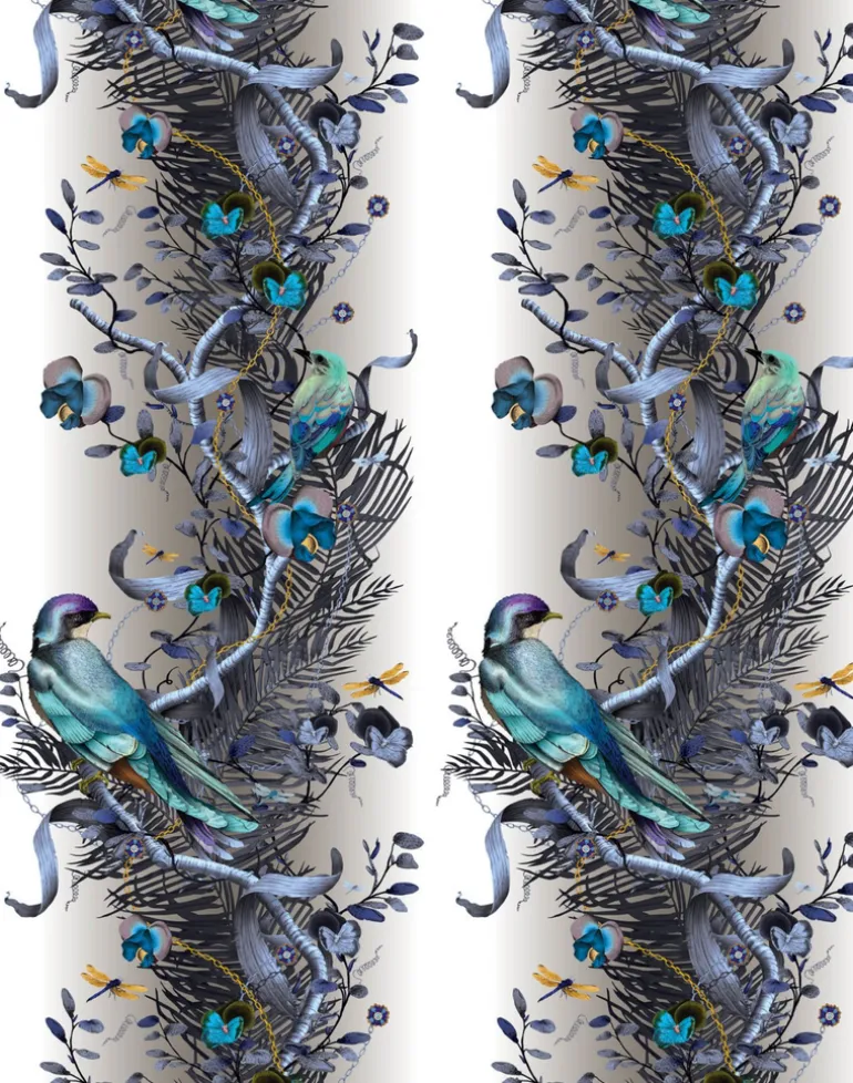 Birds in Chains is a visual symphony, at once impactful and complex. The luminous majesty of the birds arrests the eye, whilst the intricacy of the ever-unfurling ornamental and botanical design keep the gaze rapt. The vertical, serpentine repeat of twisting vines, palms and chains give a sense of soaring dimension. Electric flashes of color loom out of subdued hues, and the near-neon bright birds seem as though they might lift off the walls and take flight. The column-like repeat of the design adds an architectural dimension, and the exuberance of imagery and colour imbue a space with lyricism and a sense of play.