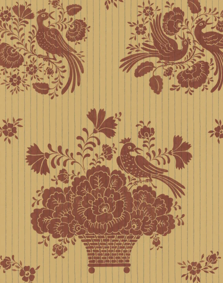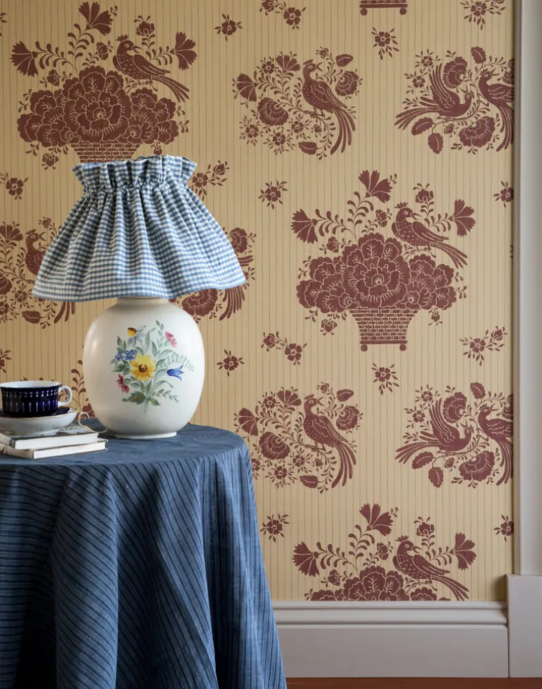 The design is inspired by the Swedish ”Kurbits” painting. A style featuring light brush strokes and depictions of gourds (kurbits), leaves and flowers, used especially in the decoration of furniture and wall hangings in the county of Dalarna, Sweden. The Kurbits pattern is printed on a pin-striped background with inspiration from Japanese fabrics. A real eclectic mix!