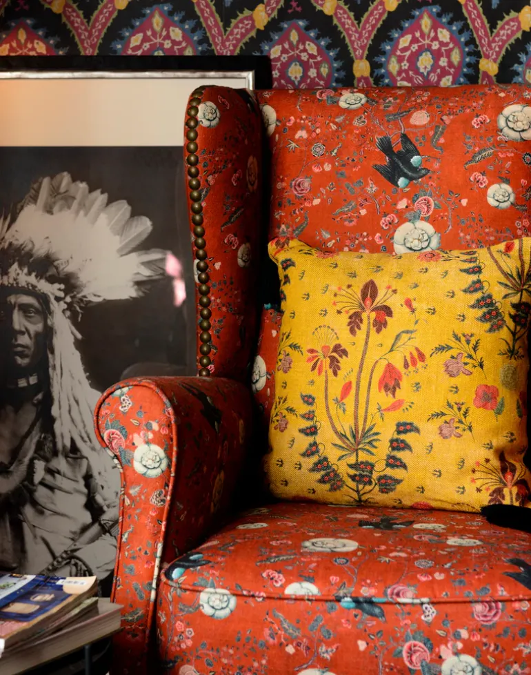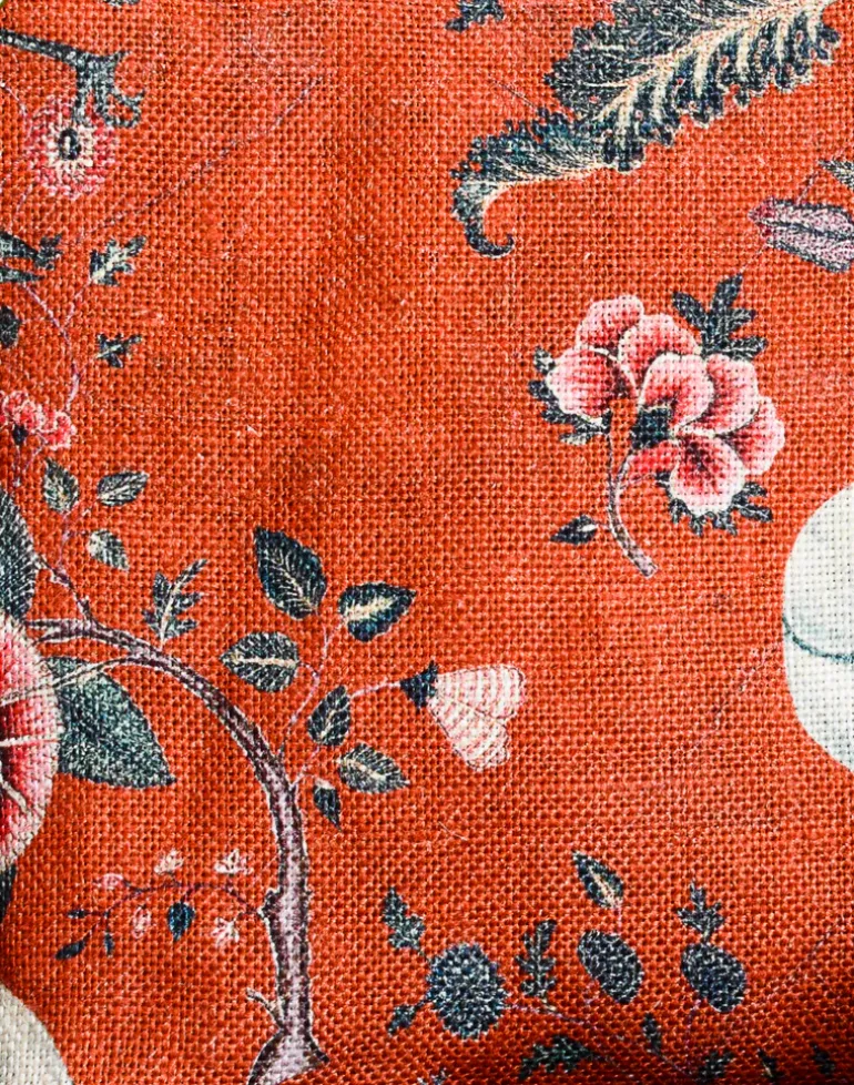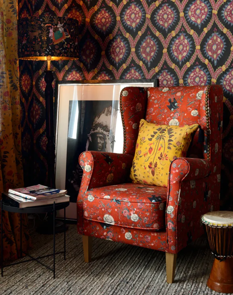 An interesting artwork, on a red background, with spectacular floral motifs, inspired from the bohemian lifestyle.