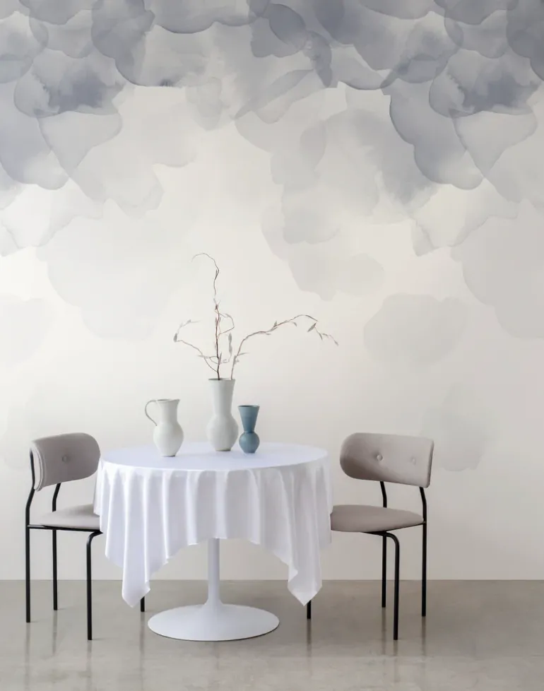 Layers of hand-painted watercolor flow across the paper, designed to bring restfulness to a room, adding a delicate and decorative touch.