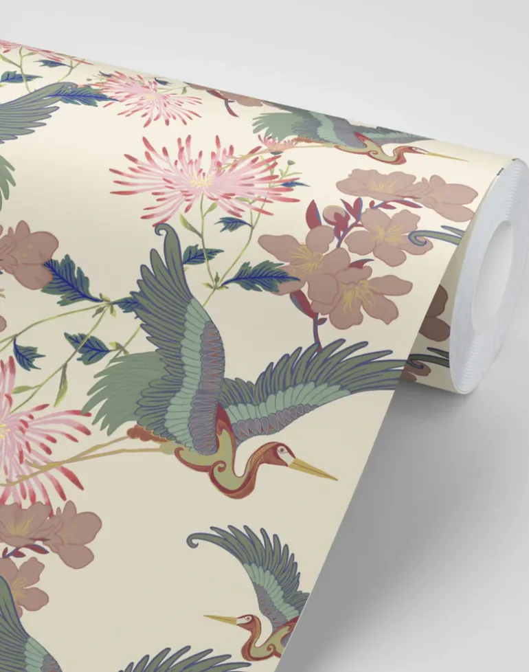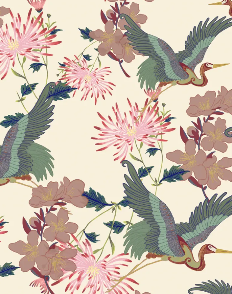 A detailed celebration of the magnificence of Mother Nature, our hedonistic Blossom print is rich in movement and meaning. The hand-drawn cranes in flight represent positive change, while bursts of cherry blossoms symbolize renewal.