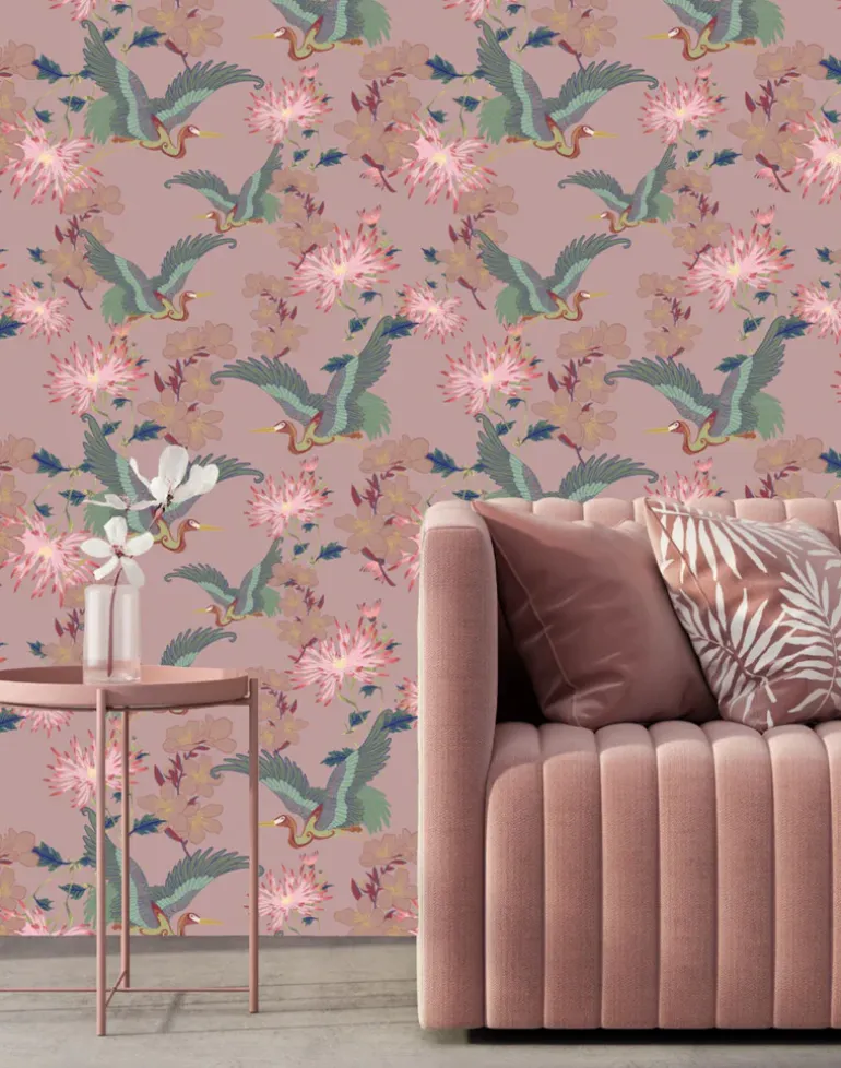 A detailed celebration of the magnificence of Mother Nature, our hedonistic Blossom print is rich in movement and meaning. The hand-drawn cranes in flight represent positive change, while bursts of cherry blossoms symbolize renewal.