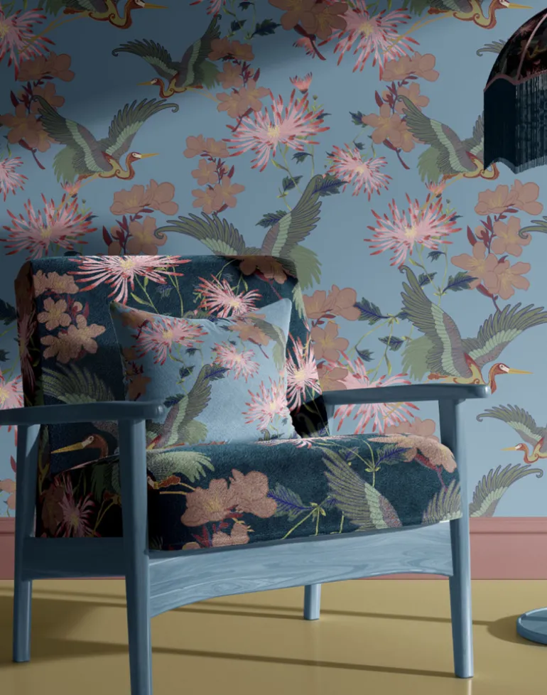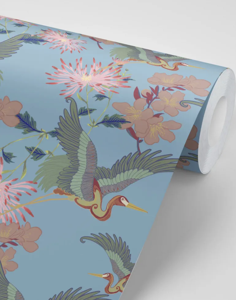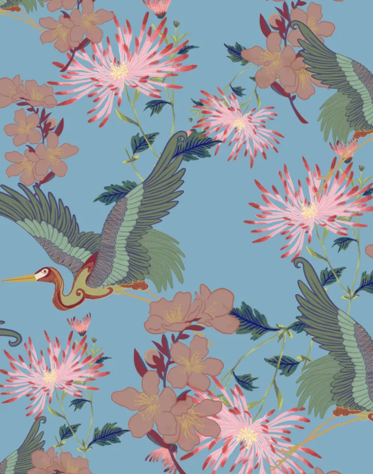 A detailed celebration of the magnificence of Mother Nature, our hedonistic Blossom print is rich in movement and meaning. The hand-drawn cranes in flight represent positive change, while bursts of cherry blossoms symbolize renewal.