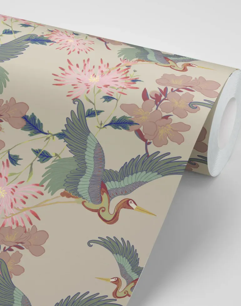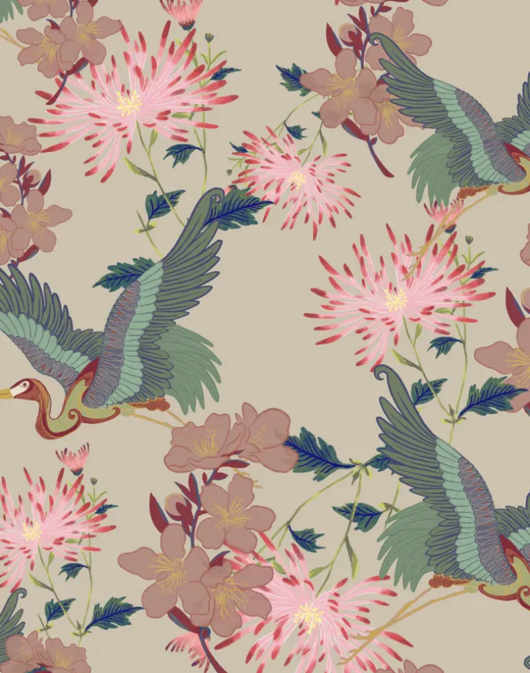 A detailed celebration of the magnificence of Mother Nature, our hedonistic Blossom print is rich in movement and meaning. The hand-drawn cranes in flight represent positive change, while bursts of cherry blossoms symbolize renewal.