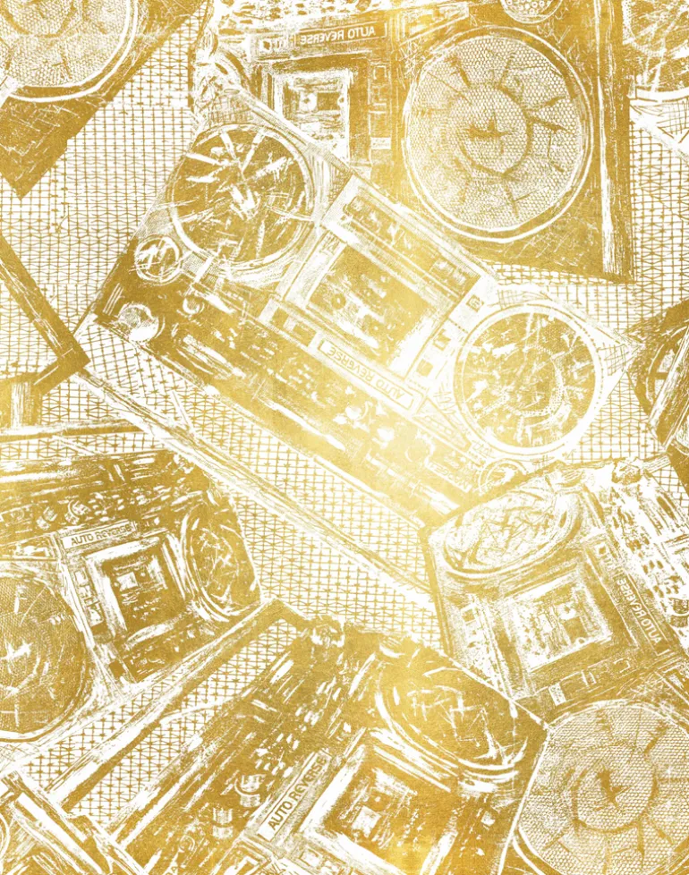 Boom Box was inspired by the cultural touchstone of growing up in the ‘80s—being fascinated by and worshiping the boombox. For Merenda, it was recording her own voice, the radio and listening to it constantly. The gold and black color way was inspired by RUNDMC, a legendary Queens Hip Hop group, whose tape Merenda would listen to over and over again, while staring at the speakers.