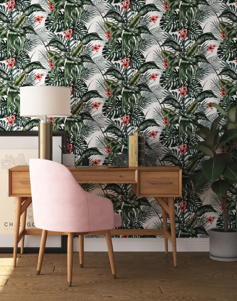Botanical Garden submerges you into a beautiful, tropical paradise, combining a range of lush, detailed exotic plants with a pop of bright pink flowers. The design was inspired by a fabulous trip to Dublin Botanical Gardens, which is such a beautiful place brimming with vibrant inspiration. Our detailed hand drawings create depth and texture within the design, immersing you into a tropical rainforest and is perfect for brightening up your office space, creating an exciting cloakroom or bringing a splash of nature into your lounge.