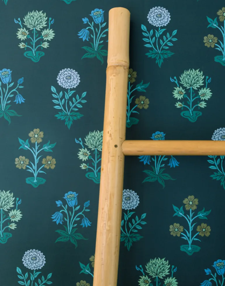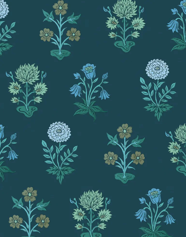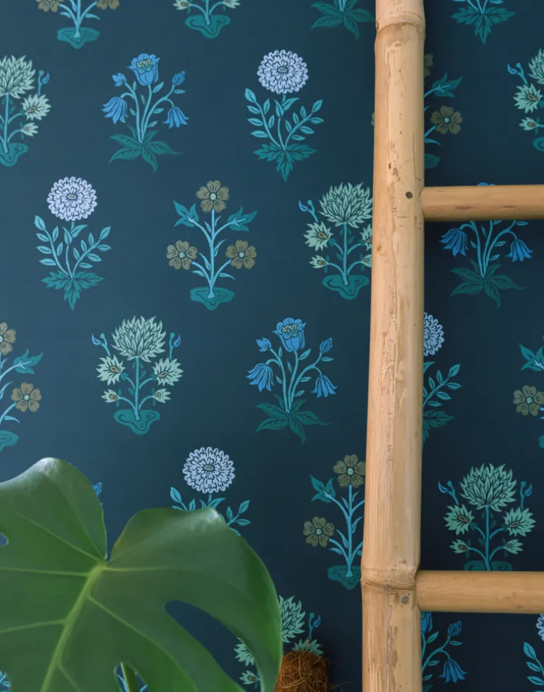 Our design Botany is a stunning floral print arranged in a rhythmic organic pattern and celebrates the ancient art of block printing. Inspired by a trip to Marrakesh the design features stylized springs of roses and dahlias delicately created using hand cut Lino stamps to replicate the textured charm of this beautiful technique. Coined ‘Botany’ after the scientific study of plants however in art and design, Botany often refers to the depiction of plant life symbolizing nature, growth and the beauty of the natural world. Our Midnight colorway depicts the light on the flowers of the palatial gardens at moonlight.