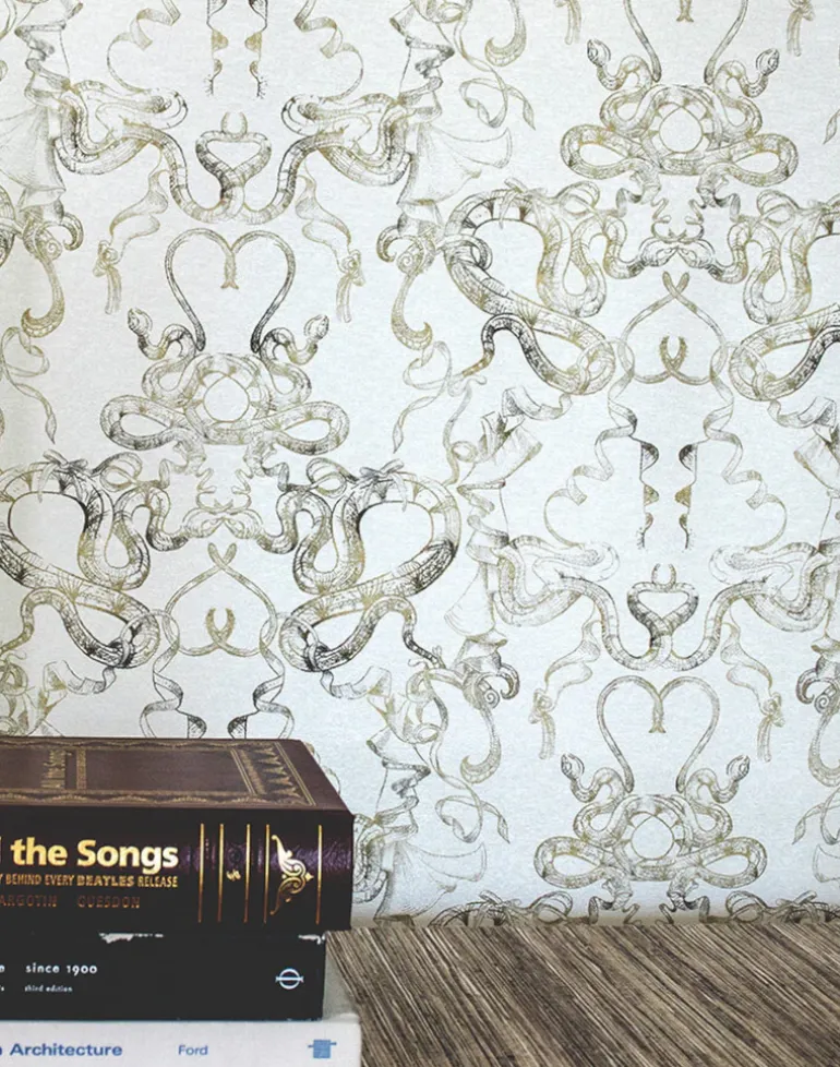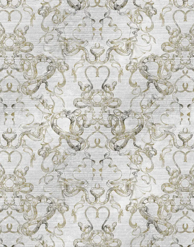 Bows and Toes…..and everything not so nice. A design that is fun and frilly, with subjects not as sweet, as sugar and spice. Breathed into existence with an artful-minded, twisted, somewhat damask pattern, amused for countless spaces– this multifarious arrangement is lavish with themes destined to inspire comment! What do you see?