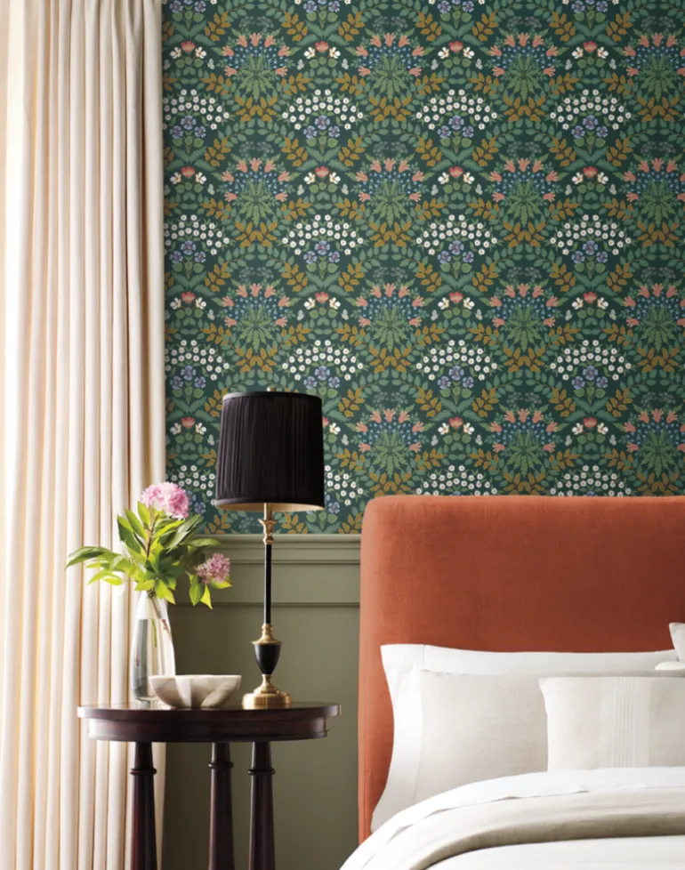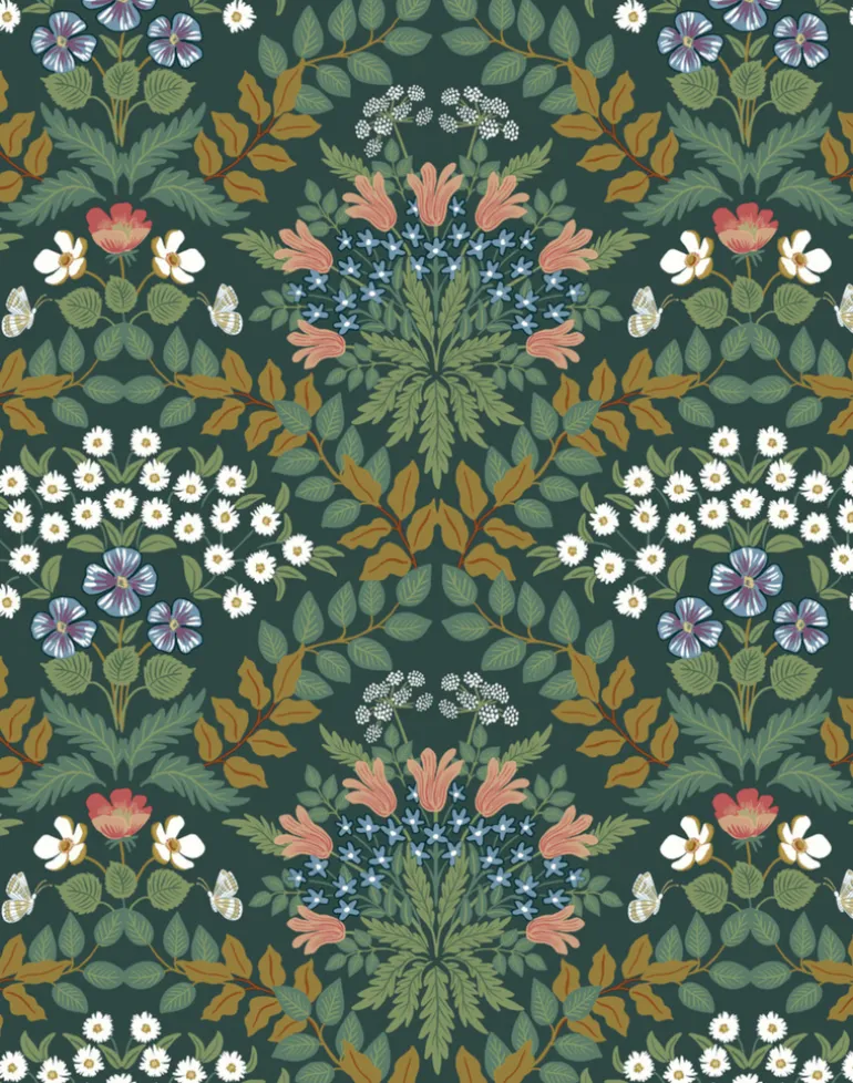 Inspired by organic, abstract floral motifs of Art Nouveau textile designs, Bramble is a detailed print that incorporates iconic Rifle Paper Co. floral elements into a mirrored design. This wallpaper is screen printed and comes in 27 inch rolls with a 25.25 inch repeat.